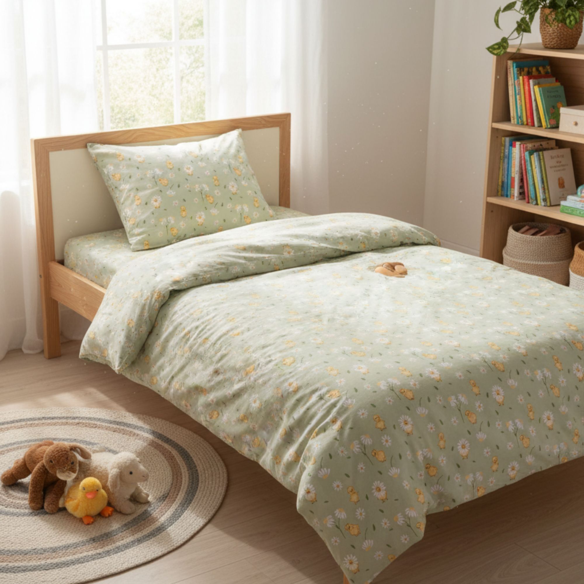 By Mats babysengetøj 70x100 cm - grønt med ællinger og blomster