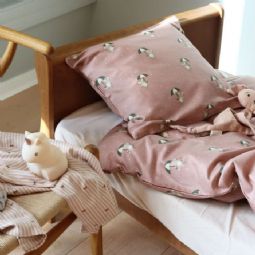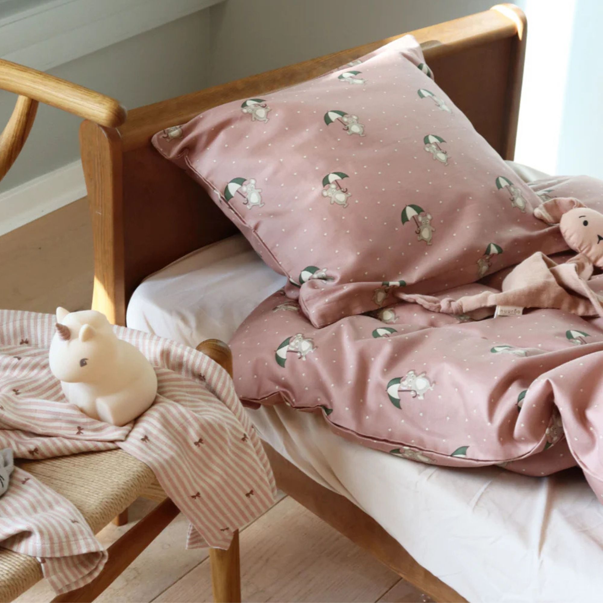 Dette fine baby sengesæt har et hyggeligt design med små mus, der holder paraplyer. Den bløde rosa baggrund kombineret med de fine detaljer skaber et varmt og roligt udtryk, som passer perfekt til et hyggeligt børneværelse.