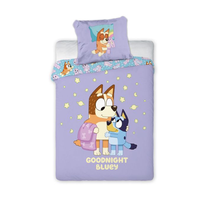 Gør sengetid ekstra hyggelig med dette Bluey junior sengetøj. Sengesættet er i 100% blødt bomuld, hvilke sikrer en god komfort hele natten. Materialet er åndbart, slidstærkt og holder farverne flotte - selv efter mange vaske. Sengetøjet er perfekt til børn, der elsker hele Bluey universet. Sengetøjet er i et vendbart motiv med et super hyggeligt motiv af Bluey og mor Chili, som krammer godnat på forsiden. På bagsiden er der et overall print af små motiver af Bluey og hendes bamse. Sengesættet er OEKO-TEX® certificeret og testet fri for skadelige stoffer, så dit barn trygt kan sove med det hver nat.