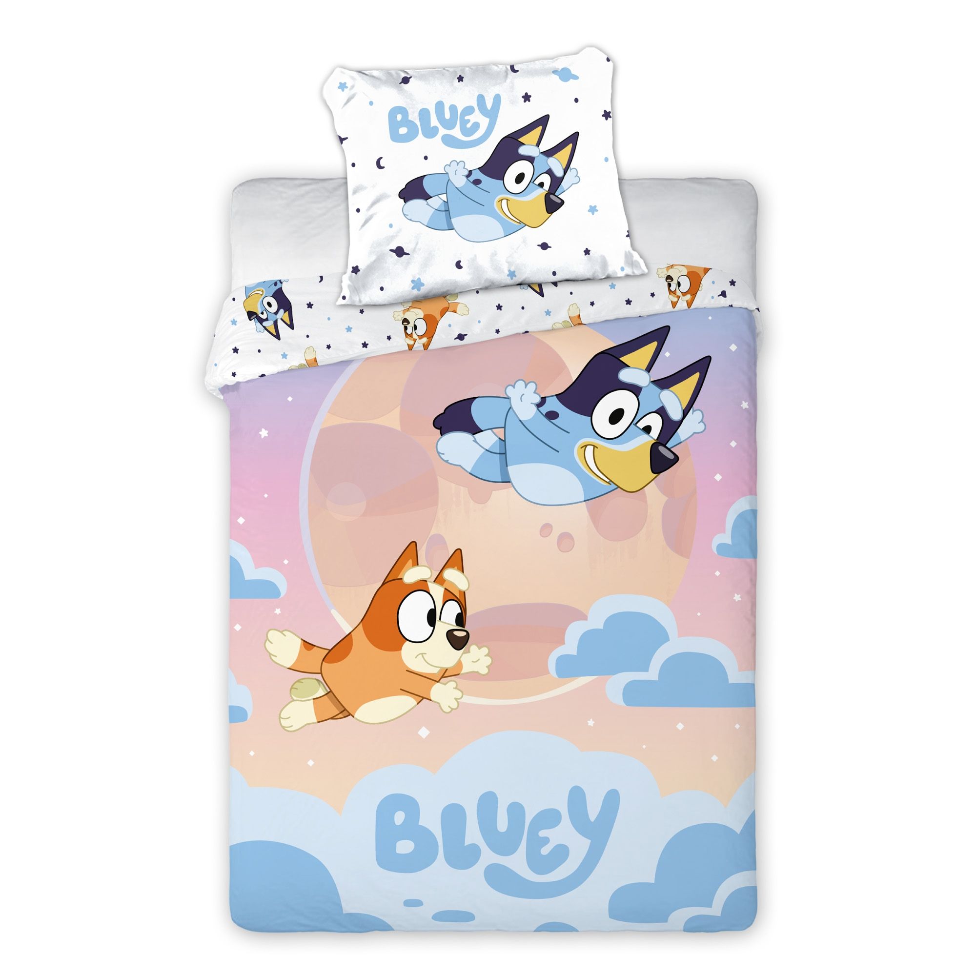 Sengesæt med den skønne og nysgerrige Bluey. Bluey er kendt fra tv-serien af samme navn og er en energisk og nysgerrig hvalp, der med sin søster Bingo forvandler hverdagen til et sandt eventyr. Sengesættet er vendbart og har billede af Bluey og Bingo, som flyver oppe i skyerne. På bagsiden er der et all-over print af små stjerner og motiver af Bluey og Bingo.