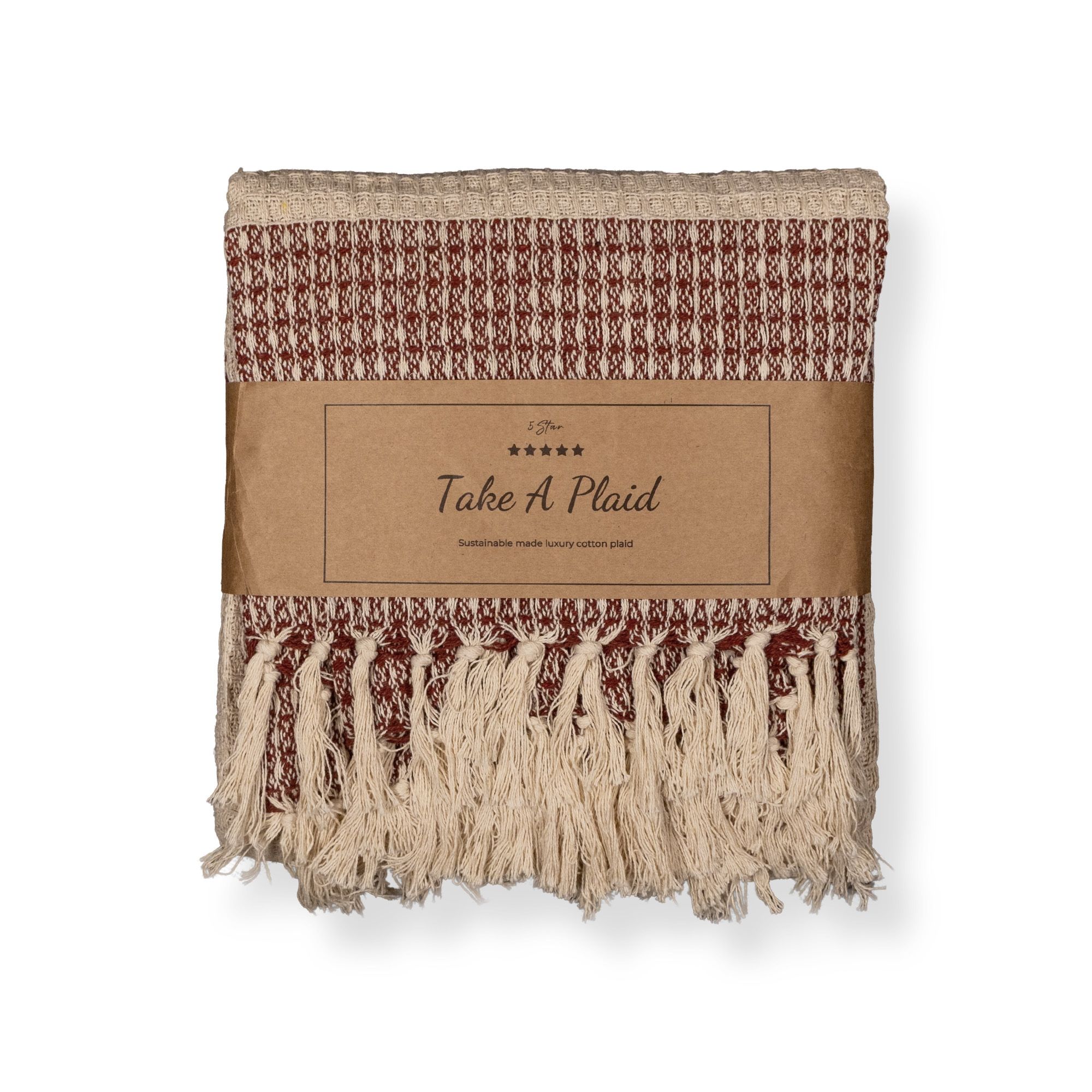 Skab en hyggelig og stilfuld stemning i dit hjem med denne smukke bomulds plaid fra Take a plaid. Plaiden er fremstillet i 100% recycled bomuld, hvilket gør den både blød, komfortabel og til et mere bæredygtigt valg.