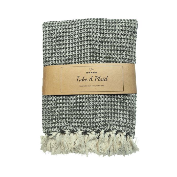 Skab en hyggelig og stilfuld stemning i dit hjem med denne smukke bomulds plaid fra Take a plaid. Plaiden er fremstillet i 100% recycled bomuld, hvilket gør den både blød, komfortabel og til et mere bæredygtigt valg.