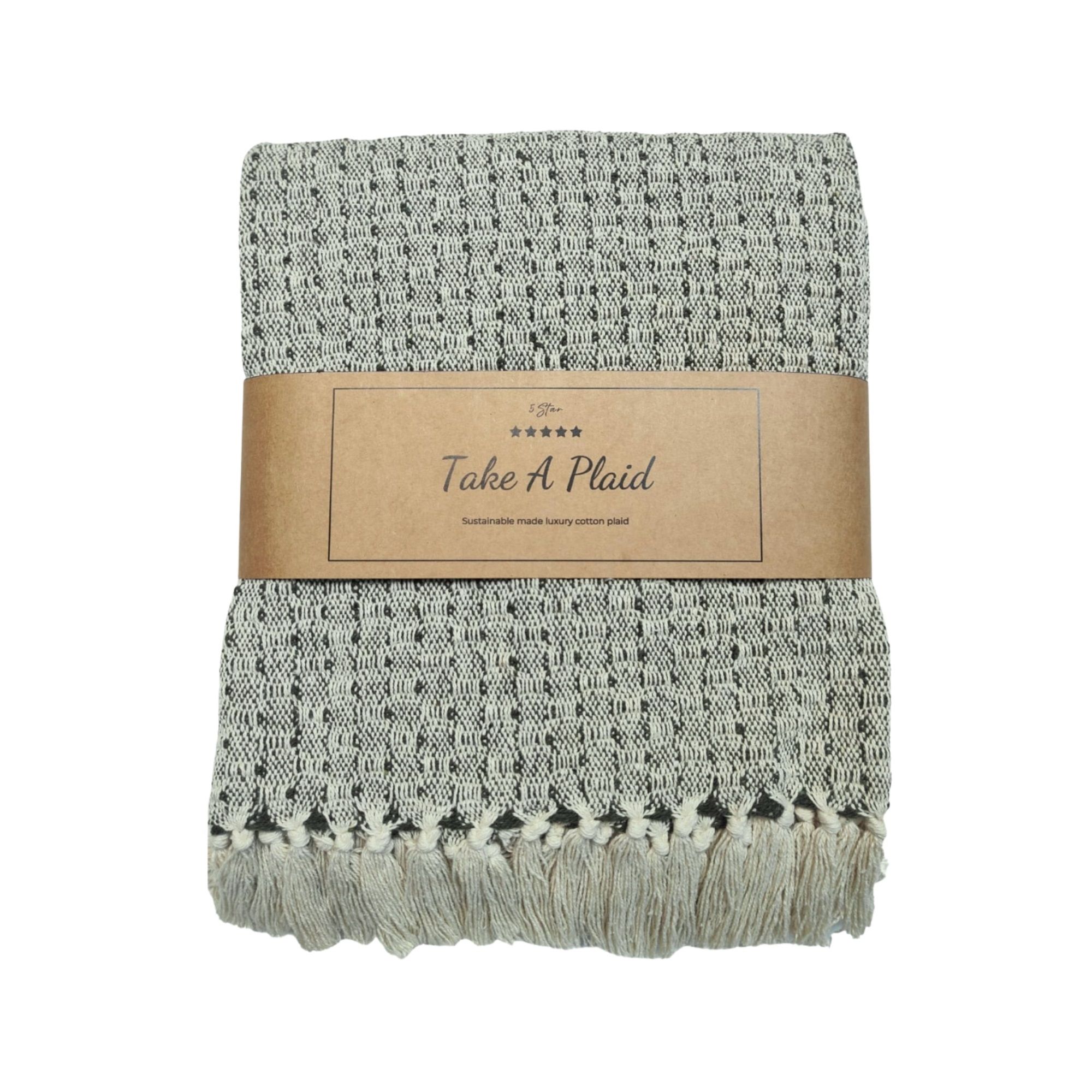 Skab en hyggelig og stilfuld stemning i dit hjem med denne smukke bomulds plaid fra Take a plaid. Plaiden er fremstillet i 100% recycled bomuld, hvilket gør den både blød, komfortabel og til et mere bæredygtigt valg.