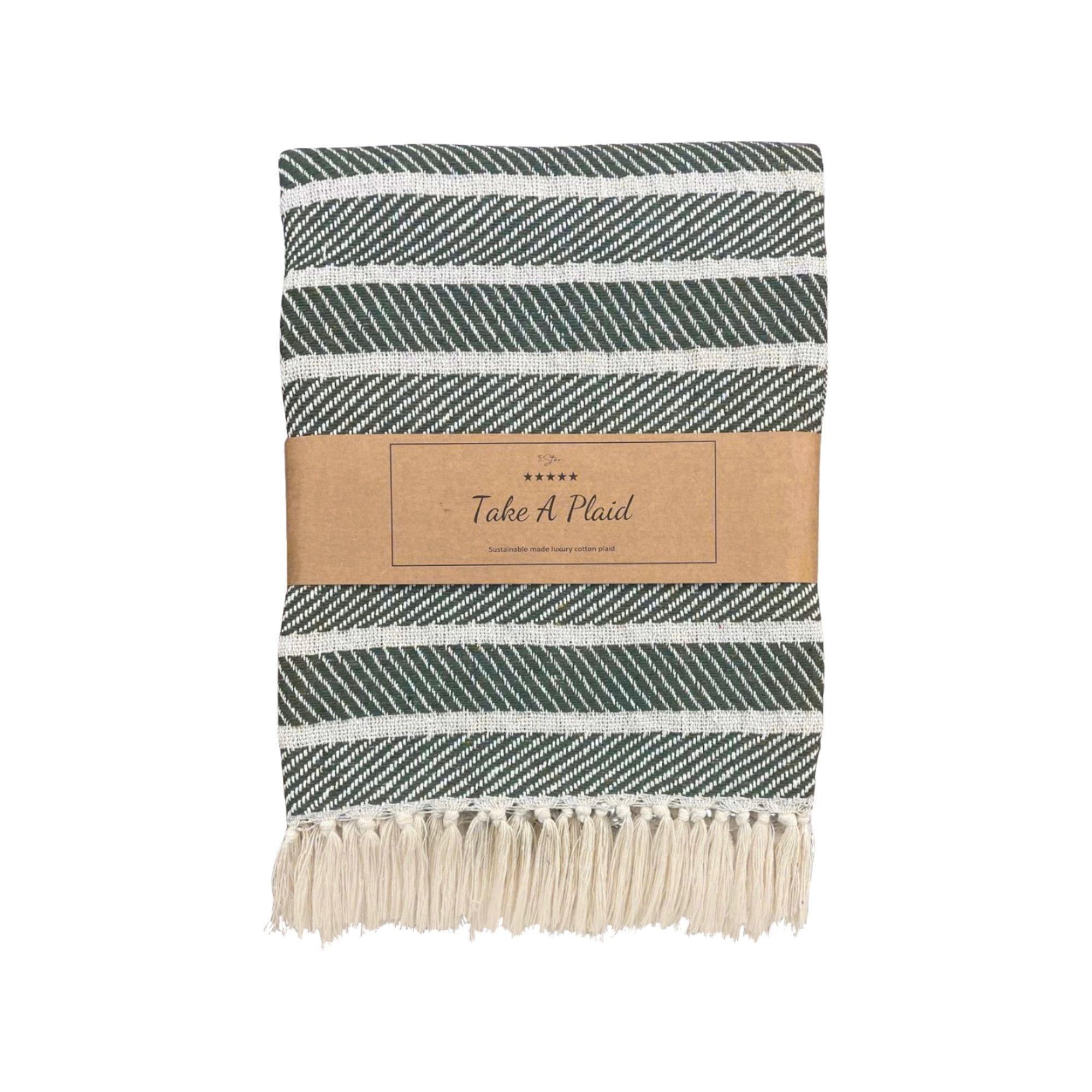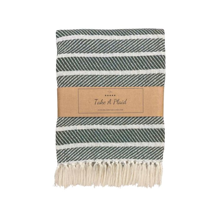 Skab en hyggelig og stilfuld stemning i dit hjem med denne smukke bomulds plaid fra Take a plaid. Plaiden er fremstillet i 100% recycled bomuld, hvilket gør den både blød, komfortabel og til et mere bæredygtigt valg.