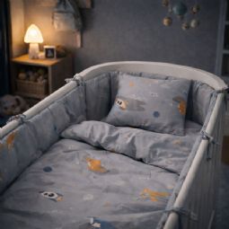 Dette fine baby sengesæt har et sejt og roligt design med små rumdinosaurer. Den bløde grå baggrund giver sengesættet et naturligt og harmonisk udtryk, som passer perfekt til et hyggeligt børneværelse.