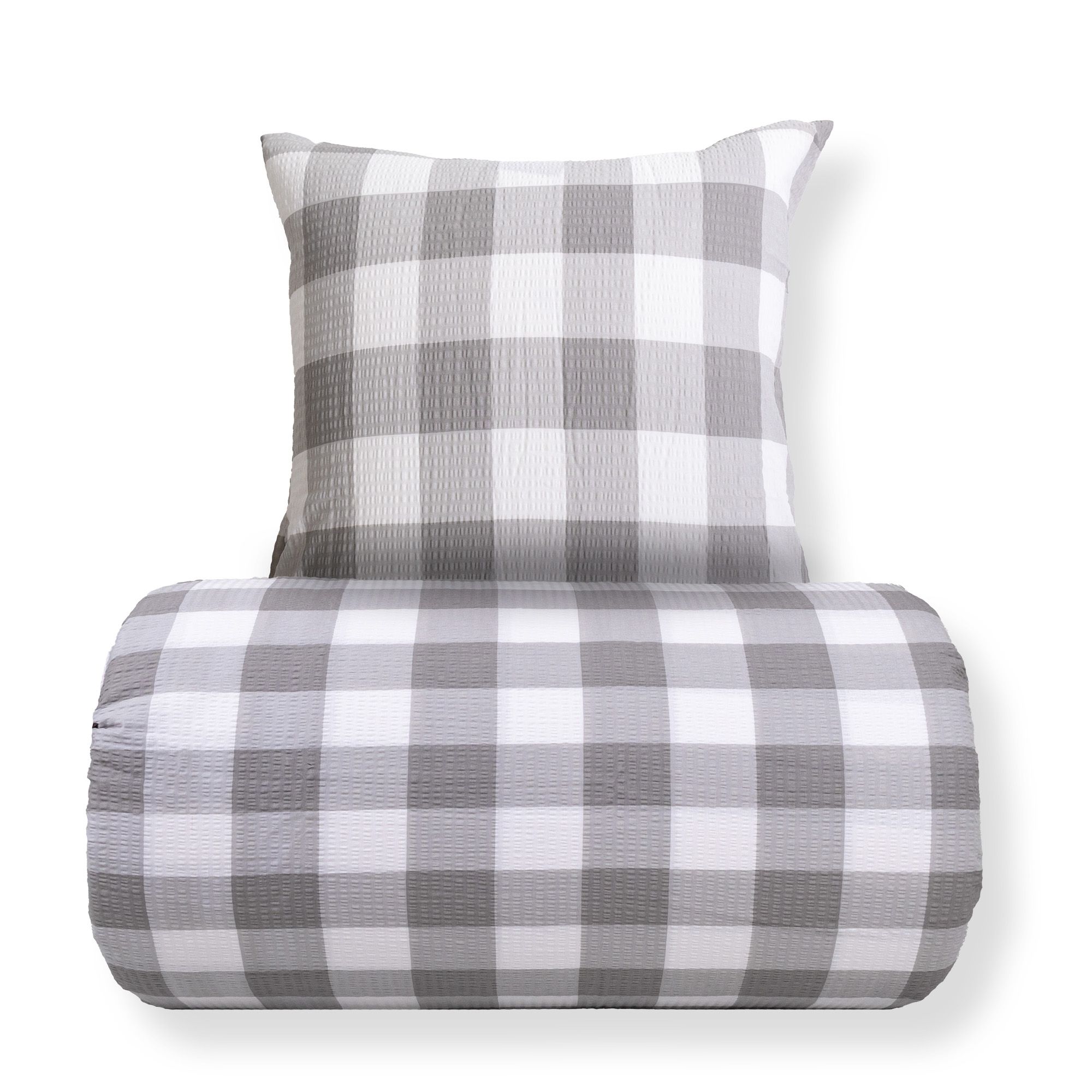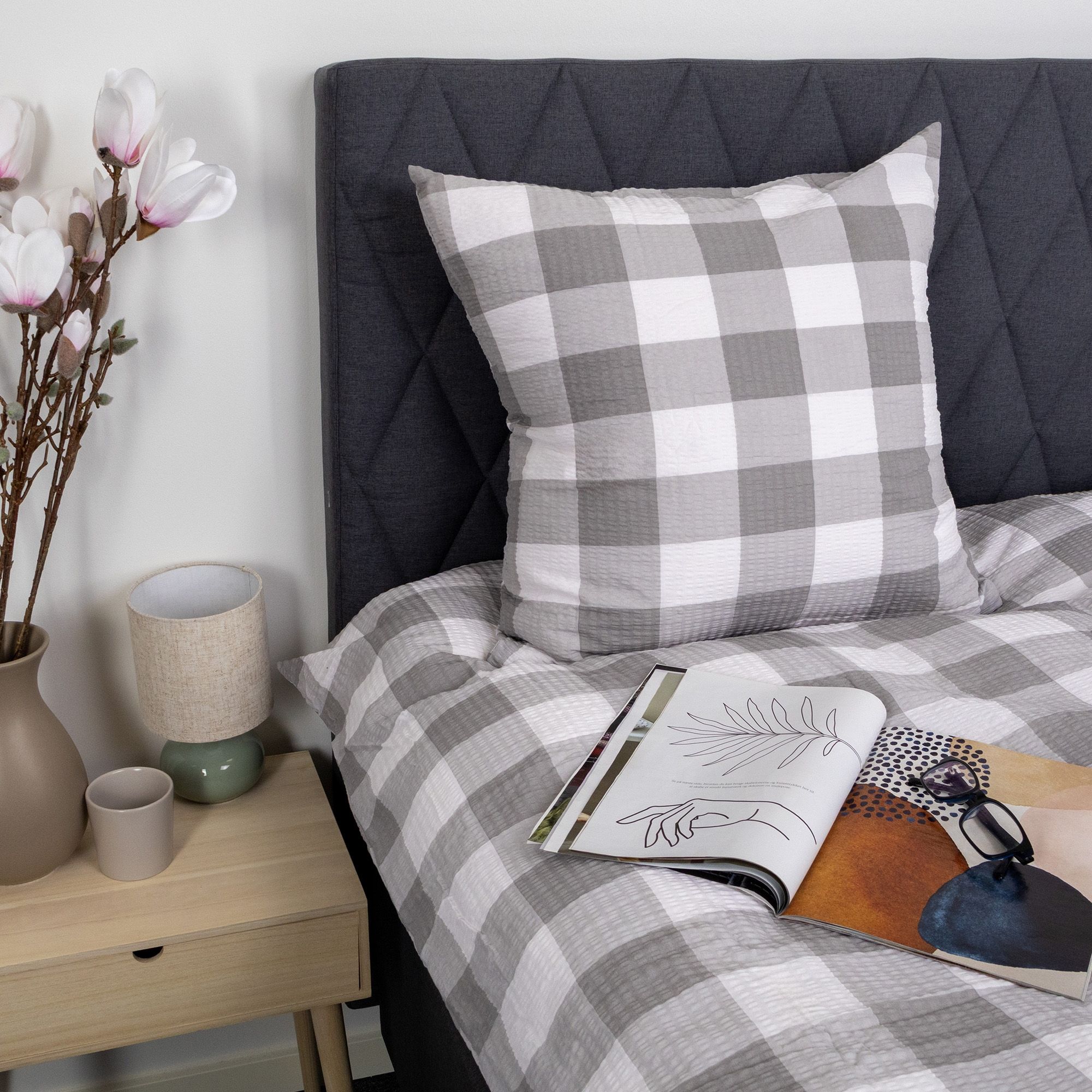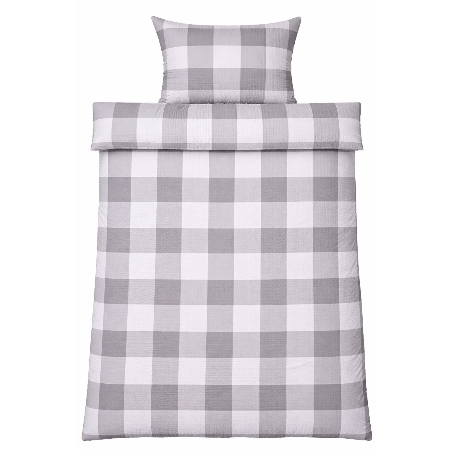 Dyne- og pudebetræk lukkes med lynlås, som gør det nemt at skifte sengetøj og holder både dyne og pude sikkert på plads natten igennem. Det ternede design i hvid og grå giver et roligt og tidløst udtryk, der passer godt ind i både moderne og klassiske soveværelser.