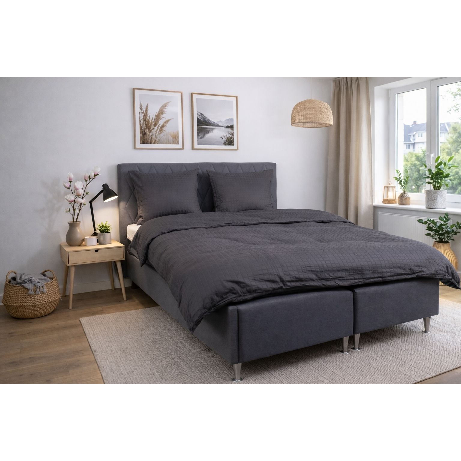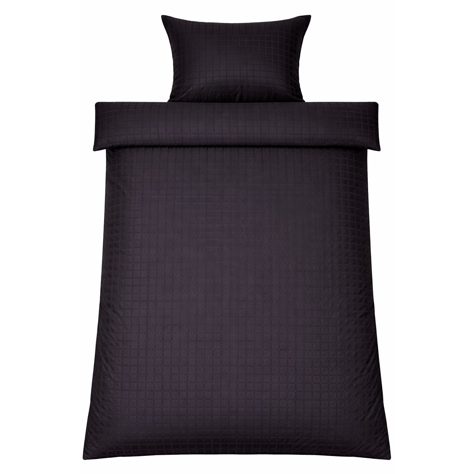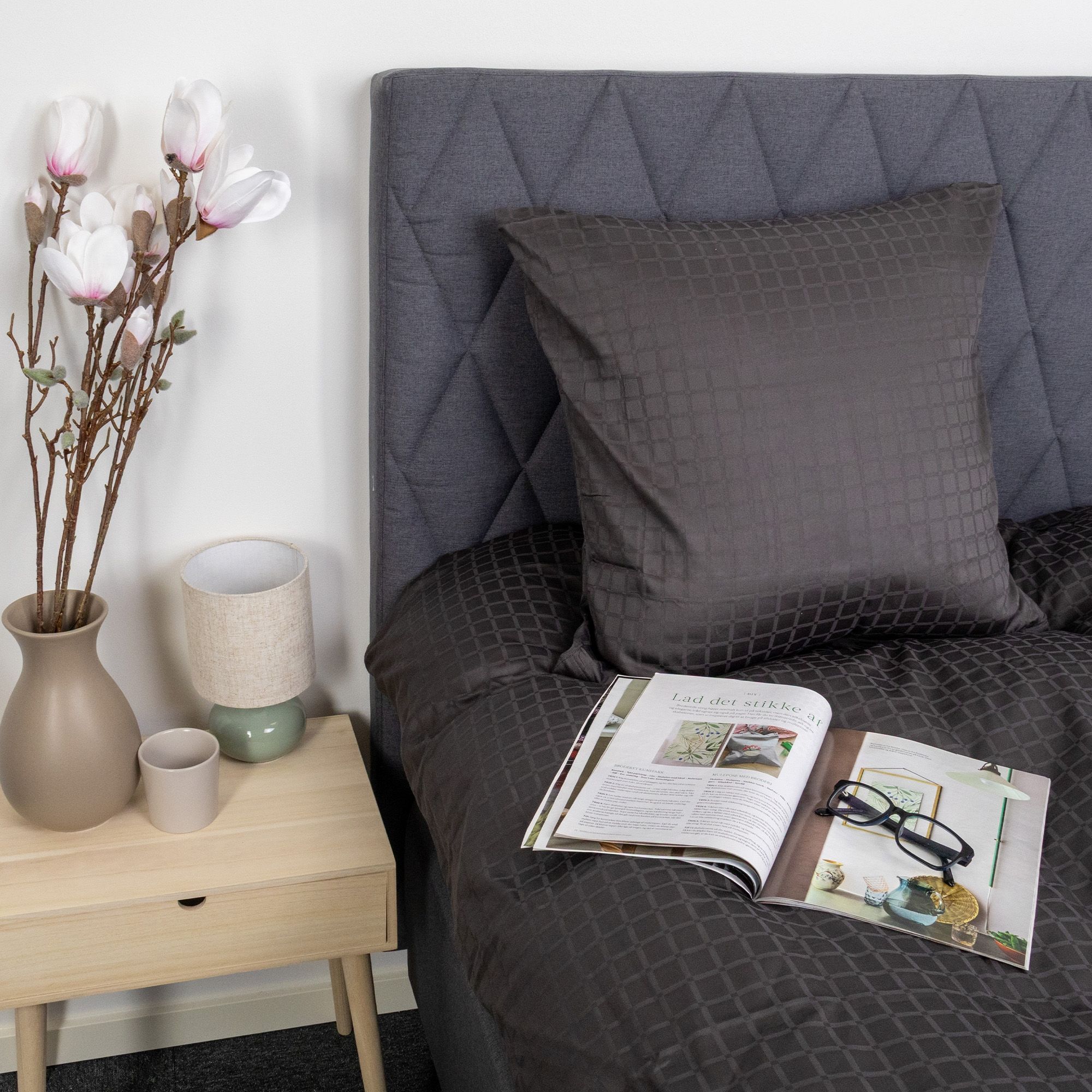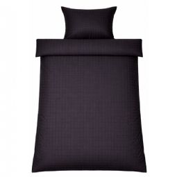 De mørkegrå firkanter giver et moderne og sofistikeret look, der passer perfekt ind i både minimalistiske og klassiske soveværelser. Dyne- og pudebetræk lukkes med skjult lynlås, som giver et pænt finish og holder dynen sikkert på plads.