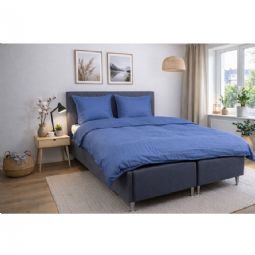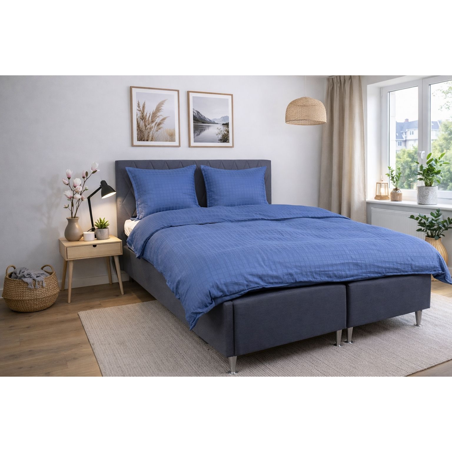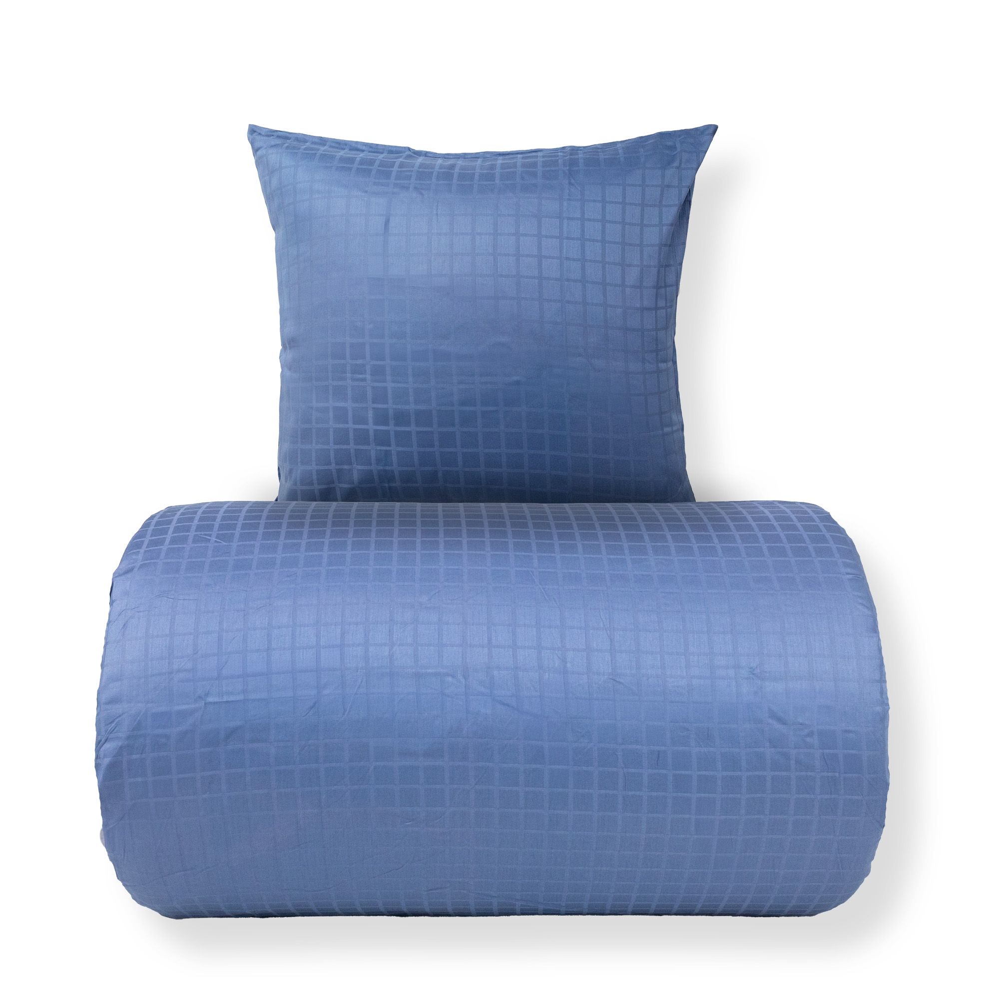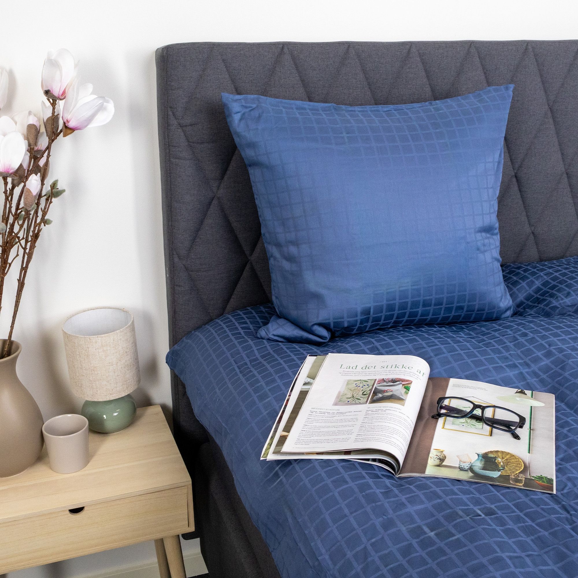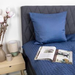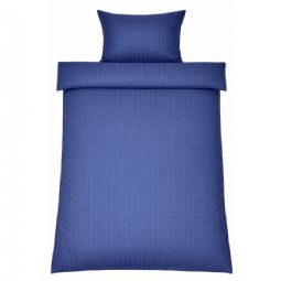 De blå firkanter giver et moderne og sofistikeret look, der passer perfekt ind i både minimalistiske og klassiske soveværelser. Dyne- og pudebetræk lukkes med skjult lynlås, som giver et pænt finish og holder dynen sikkert på plads.