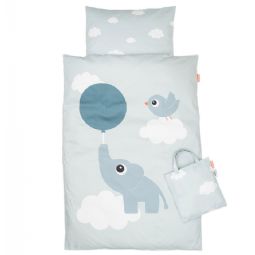 Det søde design med elefanten Elphee, Birdee, balloner og skyer skaber en tryg og legende stemning omkring baby. Sættet er vendbart, så du nemt kan skifte udtryk mellem det fine motiv og det rolige skyprint på bagsiden.