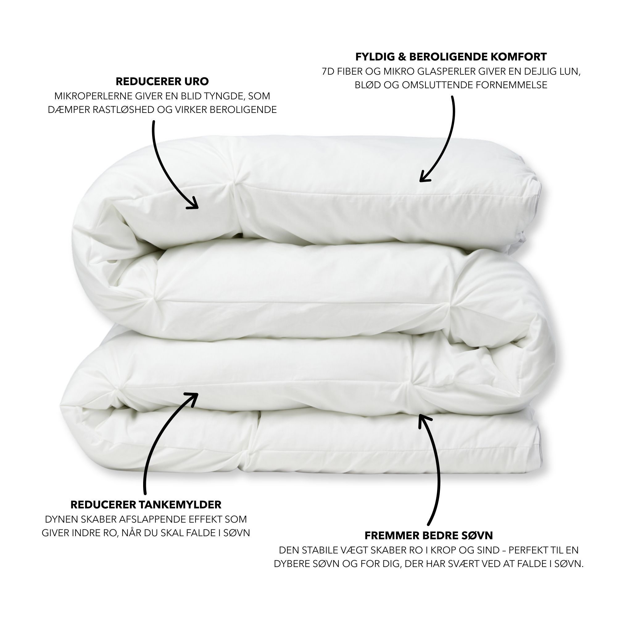 En dejlig lun hybriddyne - der kombinere alt det gode fra en tyngdedyne, med det fyldige fra en lækker fiberdyne. De fine mikro glasperler på dynens ene side sørger for en god og høj tyngde, hvor fiberfyldet på dynens modsatte side giver dynen den lækre fyldighed og jævne varme.