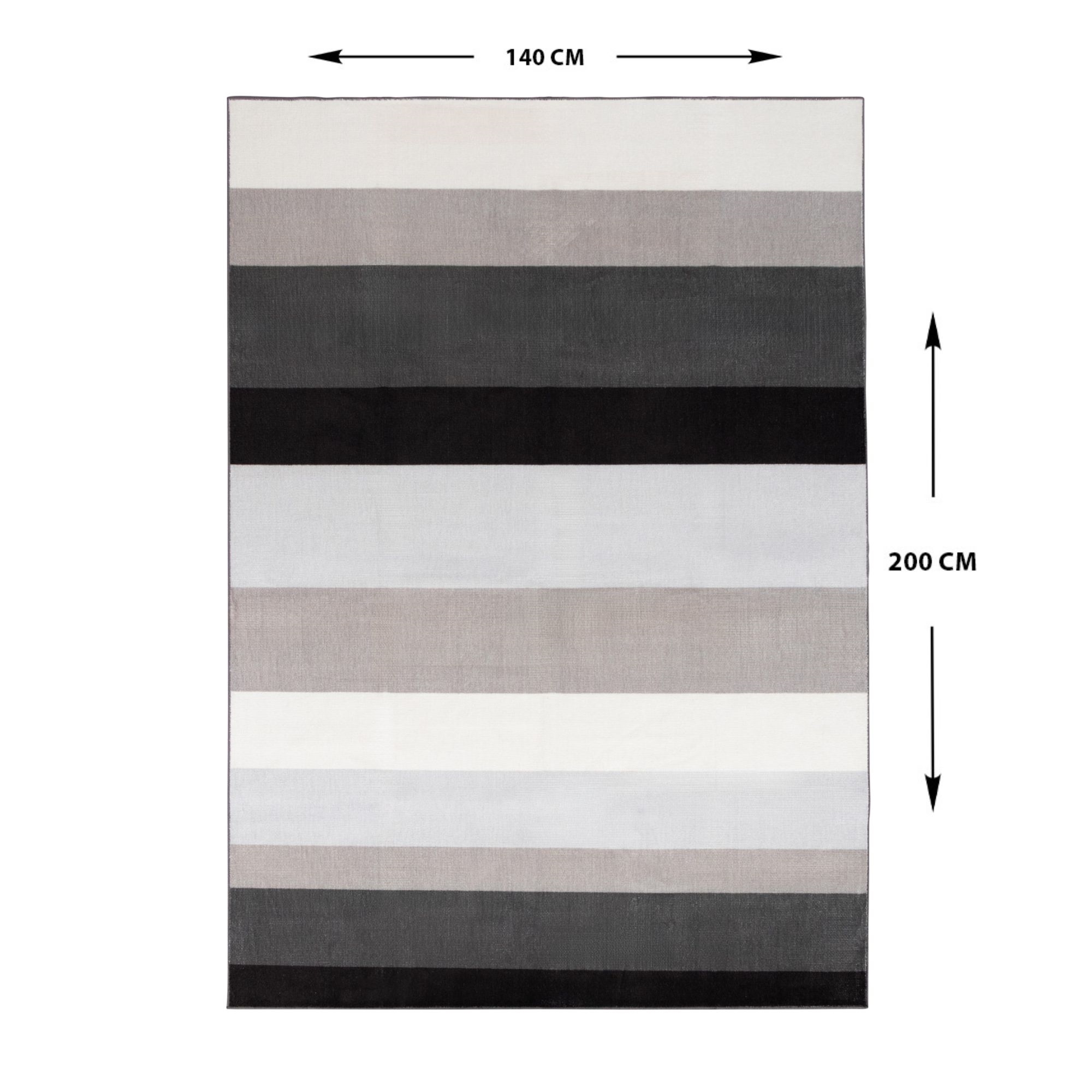 Stribet gulvtæppe produceret i lækker blød polyester og med skridsikker bagside, få et tæppe som både er rigtig slidstærkt, og som ligger fast og sikkert på gulvet. Det flotte tæppe, med stribet design, har en kort luv som gør at det føles dejligt blødt at røre ved. Det løse tæppe kan bruges ved sofaen, under spisebordet eller et helt tredje sted hvor du synes der mangler lidt varme eller ekstra hjemlig hygge.