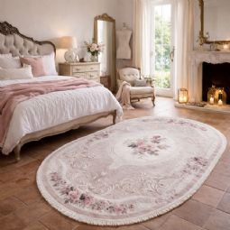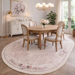 Dette ovale blomstrede gulvtæppe er et oplagt valg, hvis du ønsker et dekorativt tæppe, der både er praktisk, let at vedligeholde og elegant i sit udtryk. Kombinationen af romantisk design og funktionel kvalitet gør det til en stilfuld løsning i enhver bolig.