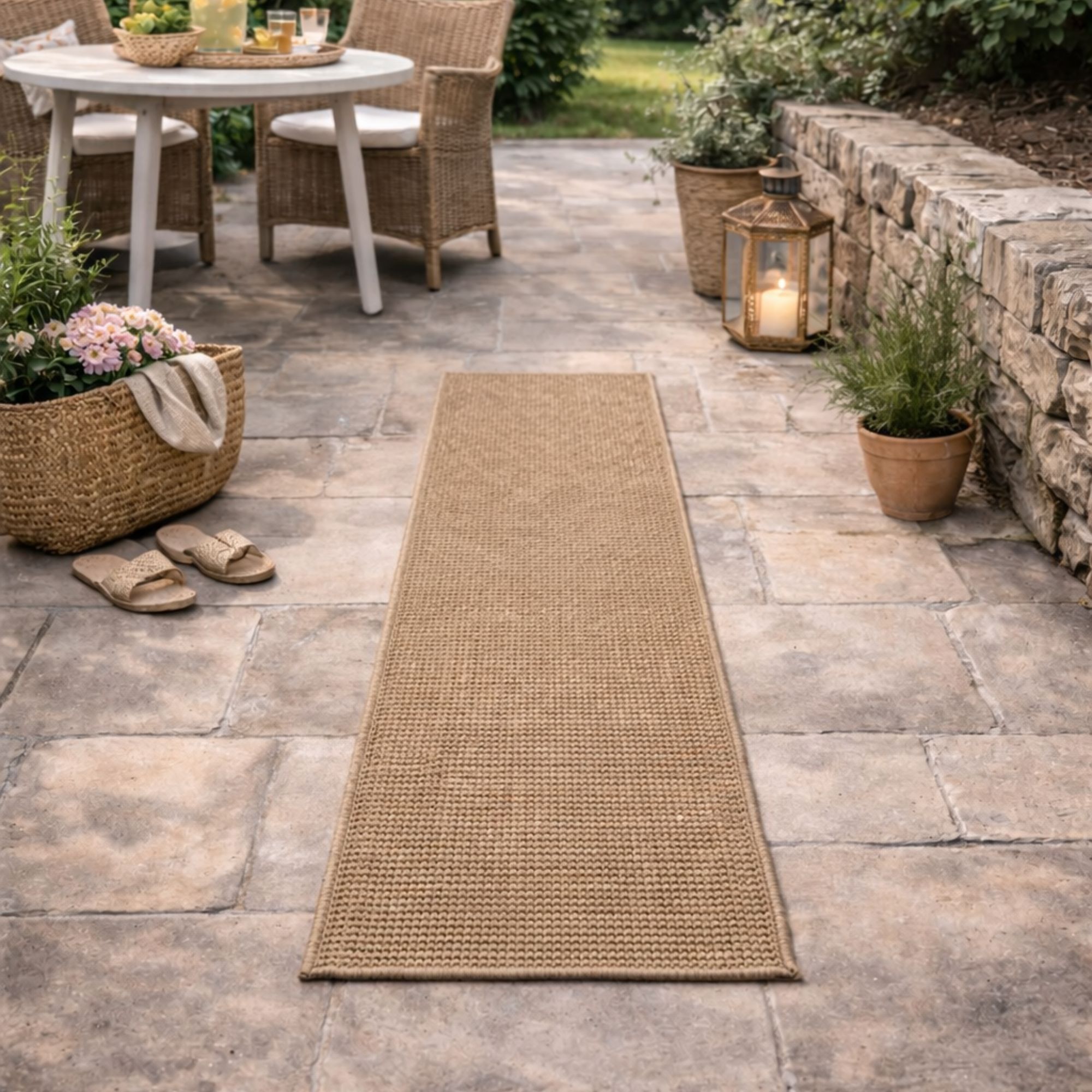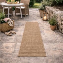 Du kan nemt skabe en hyggelig og indbydende stemning på terrassen, altanen eller i entréen med dette naturfarvede gulvtæppe i størrelsen 80x150 cm. Den smalle størrelse gør tæppet ideelt som tæppeløber, hvor det tilføjer et stilrent, naturligt udtryk. Det fungerer perfekt foran havedøren, langs altanen eller i en gang, hvor du ønsker at samle rummet og beskytte gulvet på samme tid. Tæppet er fremstillet i 100% polypropylen og har en vævet konstruktion, som giver en slidstærk og robust overflade. Materialet er særligt velegnet til udendørs brug, da polypropylen er modstandsdygtigt over for fugt og slid. Den naturlige farve gør gulvtæppet let at kombinere med både træ, metal og moderne havemøbler og er det oplagte valg, hvis du ønsker en smal, slidstærk og dekorativ tæppeløber til både ude- og indemiljø.