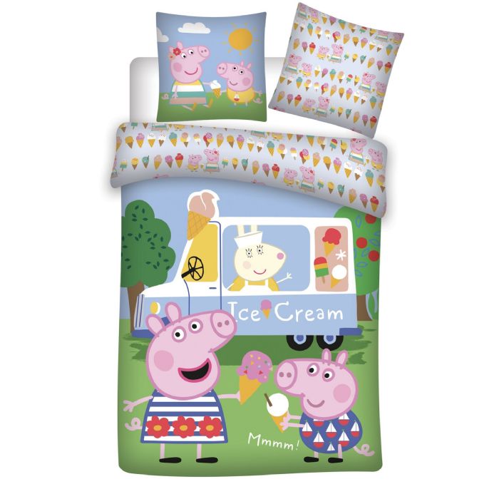 Sengetøjet er i et vendbart design. På forsiden ses Gurli og Gustav Gris der får en is ved isbilen, og bagsiden er der all-over print af Gurli og Gustav Gris, samt en masse is. Sengesættet er produceret i 100% bomuld som gør sættet slidestærkt, blødt og giver høj absorbering samt åndbarhed. Den rene bomuldskvalitet giver et lækkert og blødt sengesæt, som ovenikøbet er let at vedligeholde og skaber et dejligt sovemiljø for dit barn.