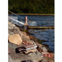 Den høje bomuldskvalitet giver en god absorberingsevne og er behagelig at tørre sig med efter badet. Designet er inspireret af de rene linjer fra klassiske saunaer og kombinerer funktionalitet med et moderne grafisk udtryk. Håndklædet er OEKO-TEX® certificeret, hvilket er din garanti for, at produktet er fri for skadelige kemikalier og sikkert at bruge mod huden.