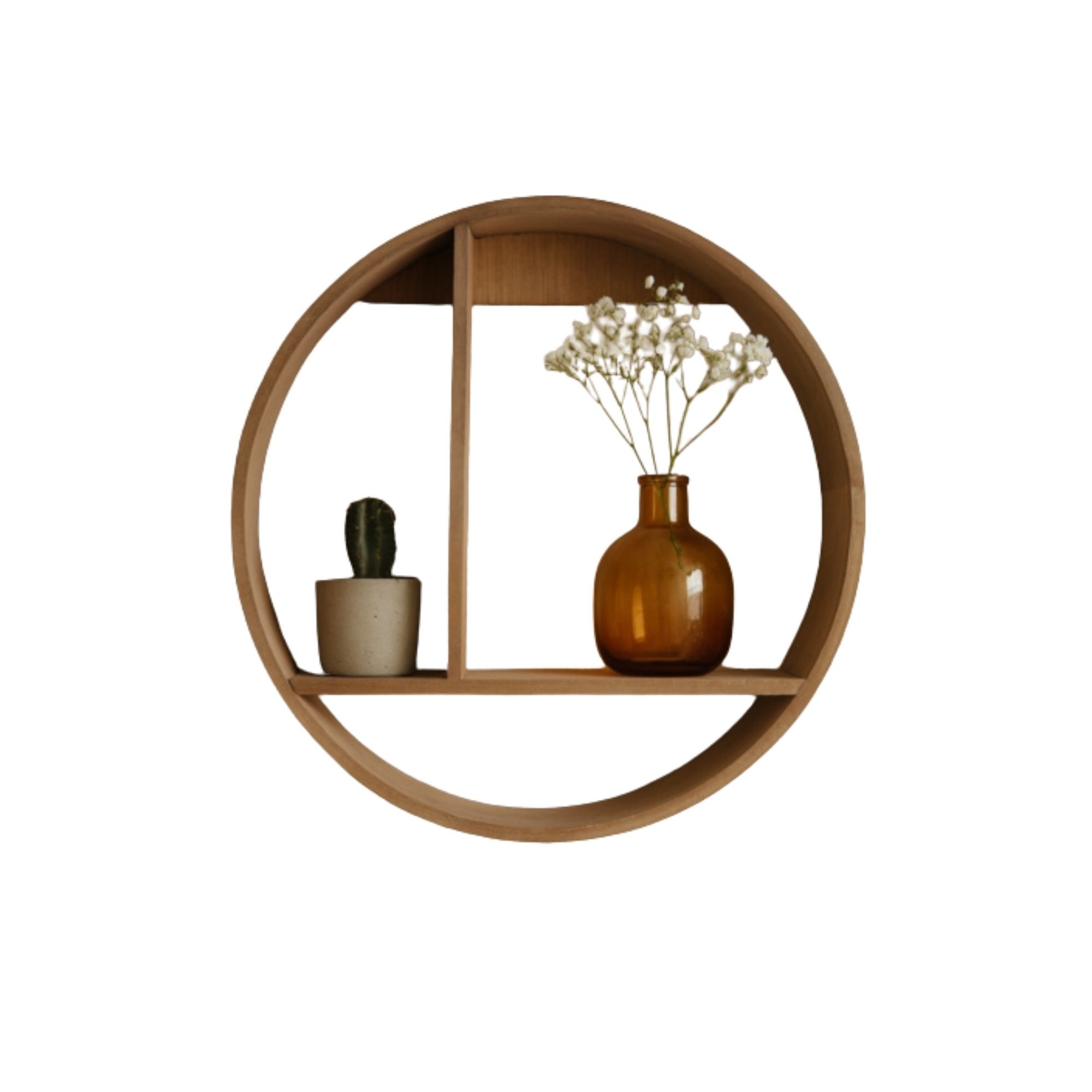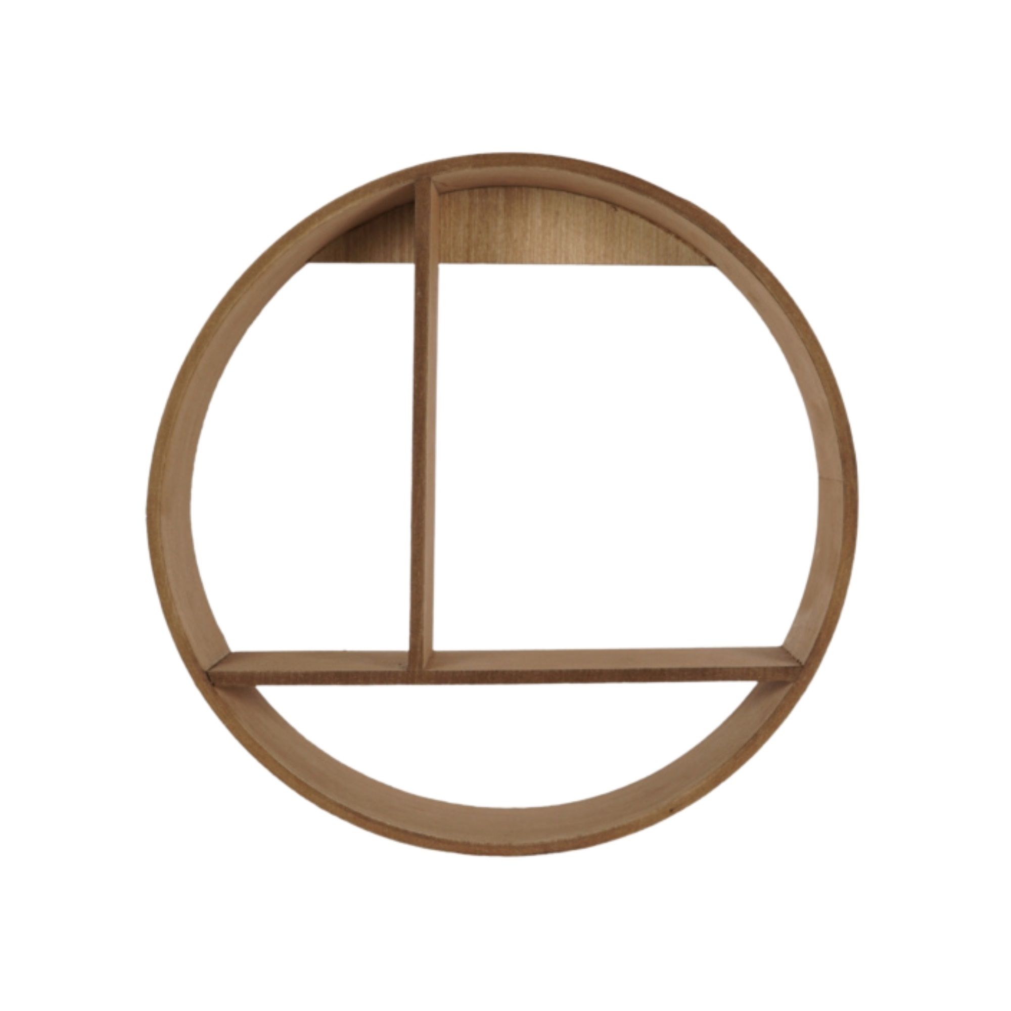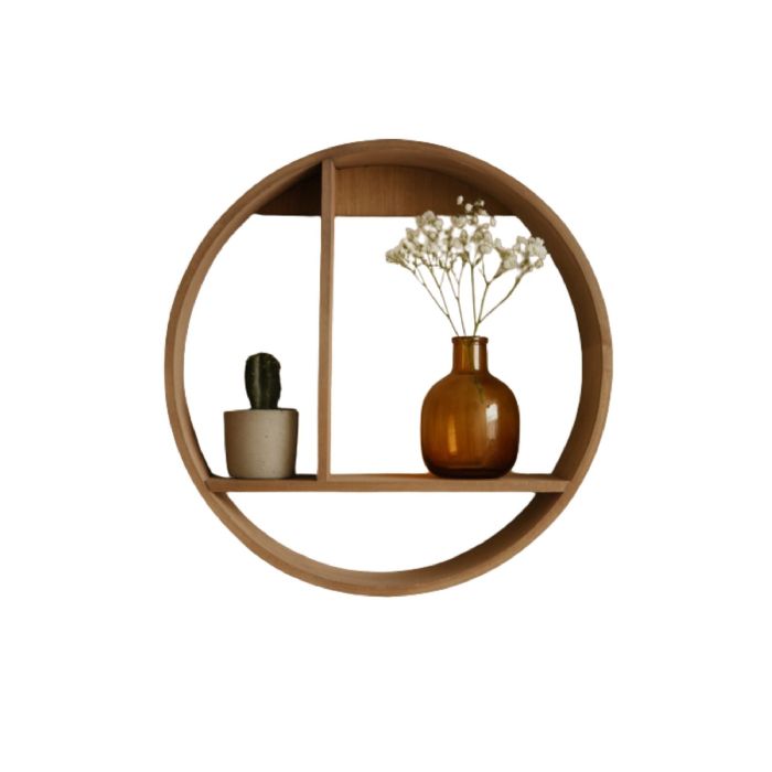 Skab et stilfuldt og personligt udtryk i dit hjem med denne runde væghylde i træ. Med sit moderne og dekorative design er hylden både praktisk og flot - perfekt til at fremhæve dine yndlingsgenstande.