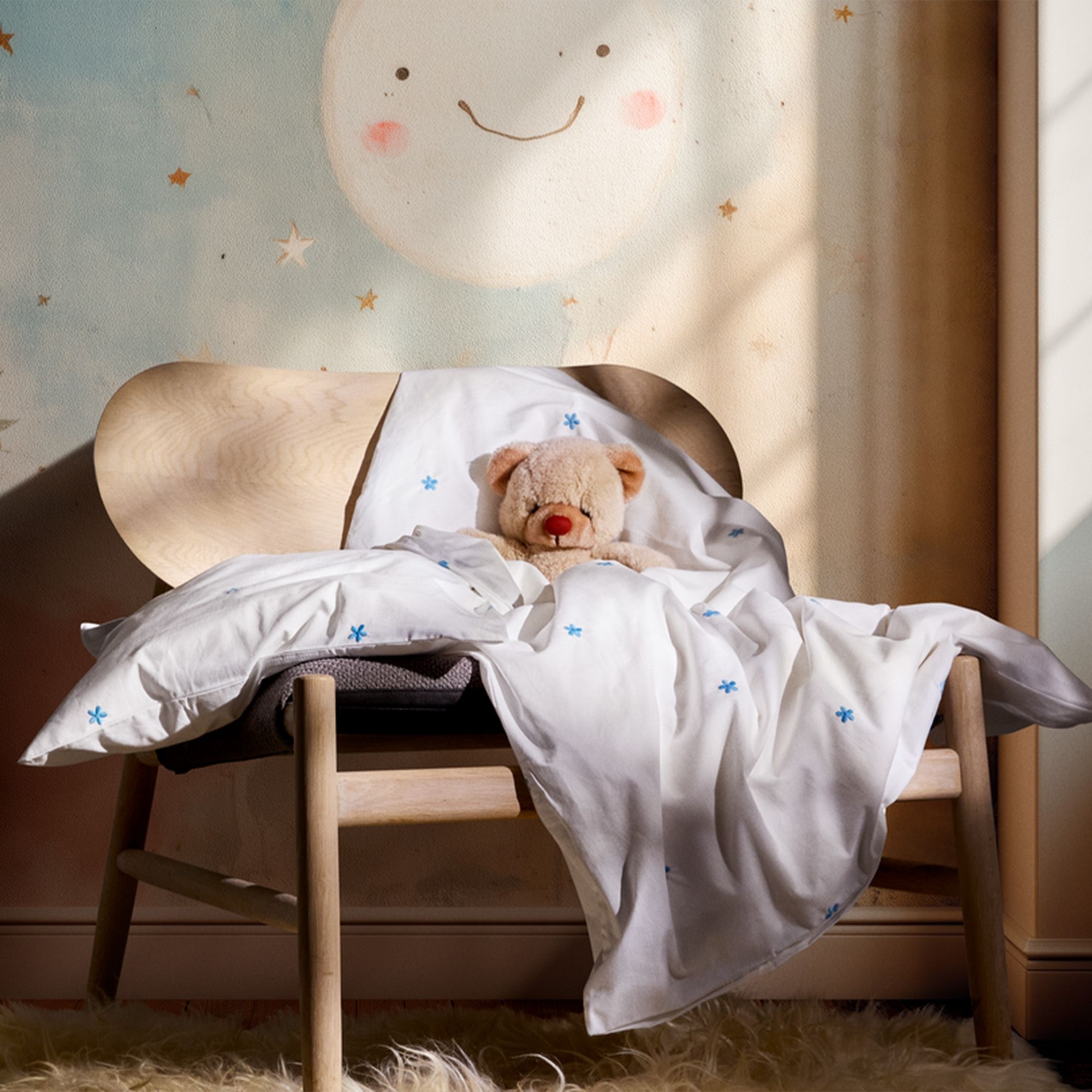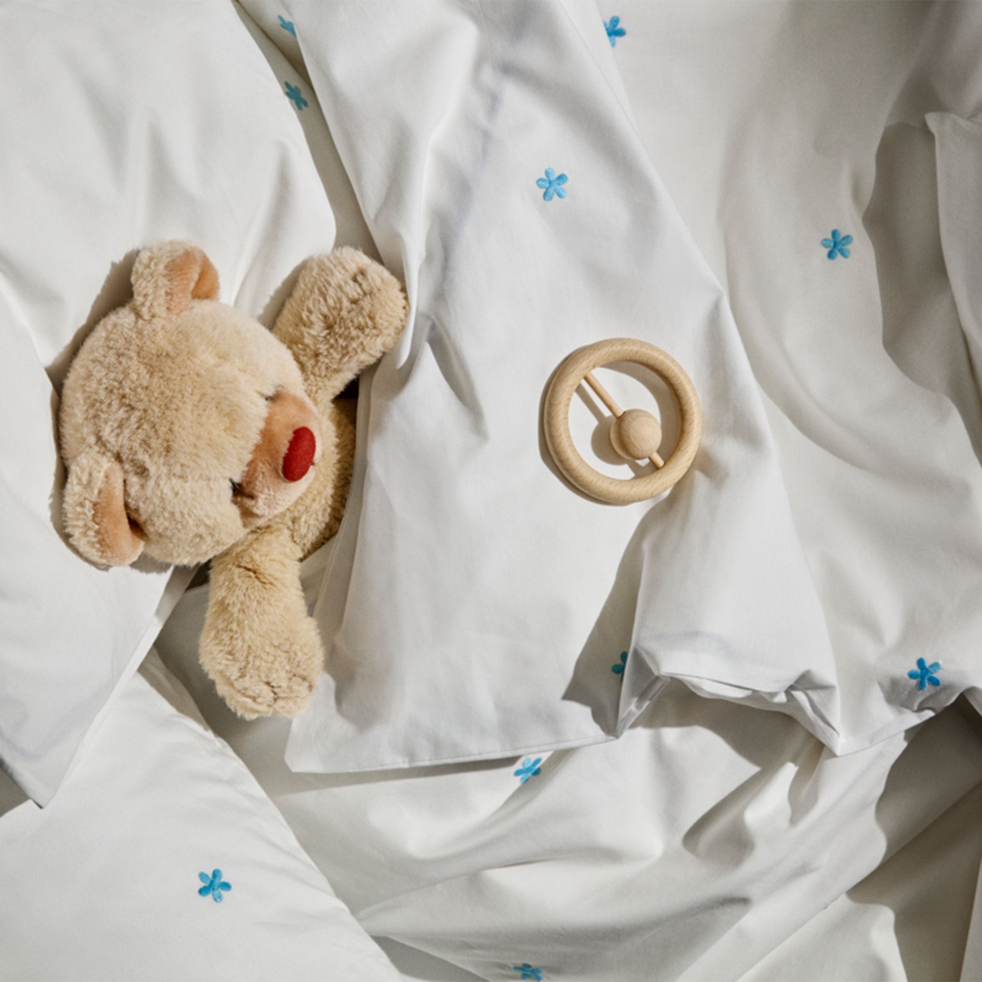 Den fine percalevævning giver en let og behagelig tekstur, samtidig med at materialet er slidstærkt og holder sig flot vask efter vask. De små broderede blomster skaber et hyggeligt og roligt udtryk, der passer perfekt ind i ethvert babyværelse.