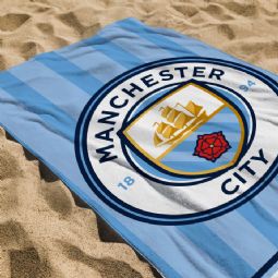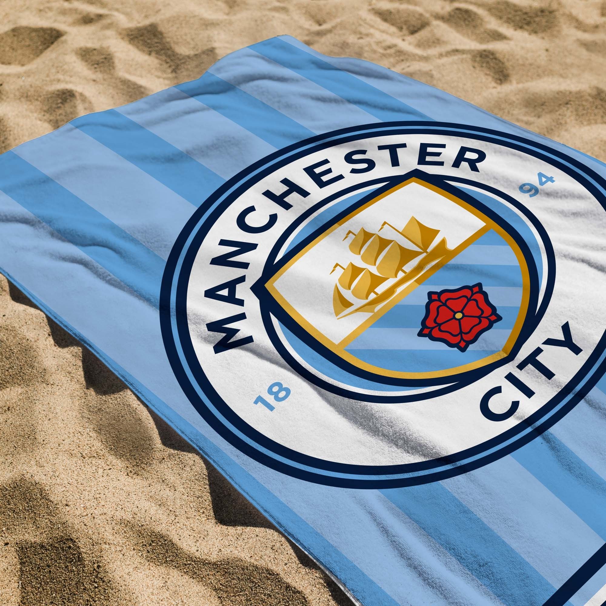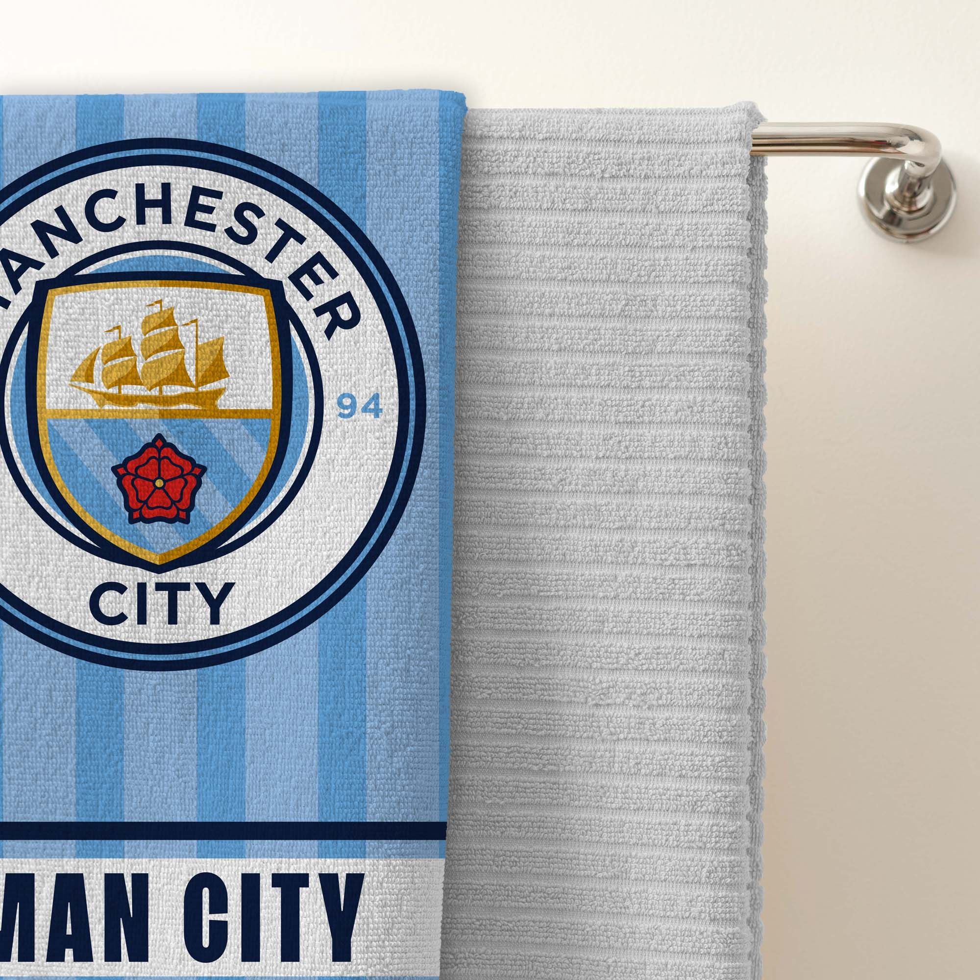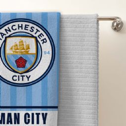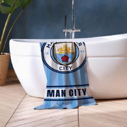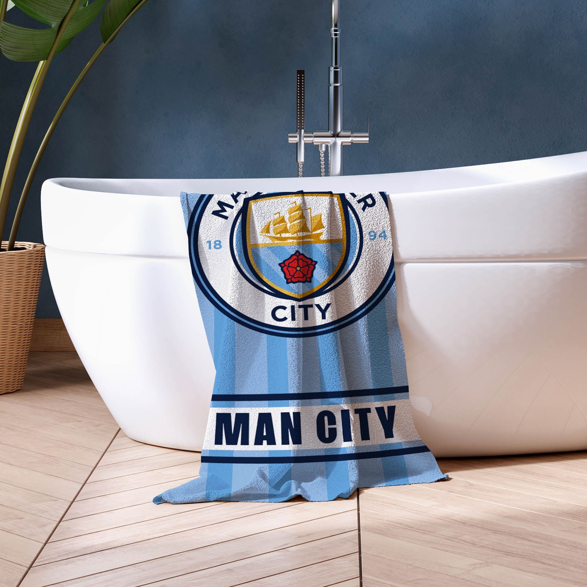 Blødt badehåndklæde i 100% bomuld, med motiv af Manchester City logo. Håndklædets fodbold motiv, vil helt sikkert bringe et smil frem på den lille fodboldfan så badetid bliver sjovere. Balancen i naturlig komfort fra det bløde materiale og det hyggelige fodbold design, gør dette håndklæde til en sikker favorit hos dit barn.
