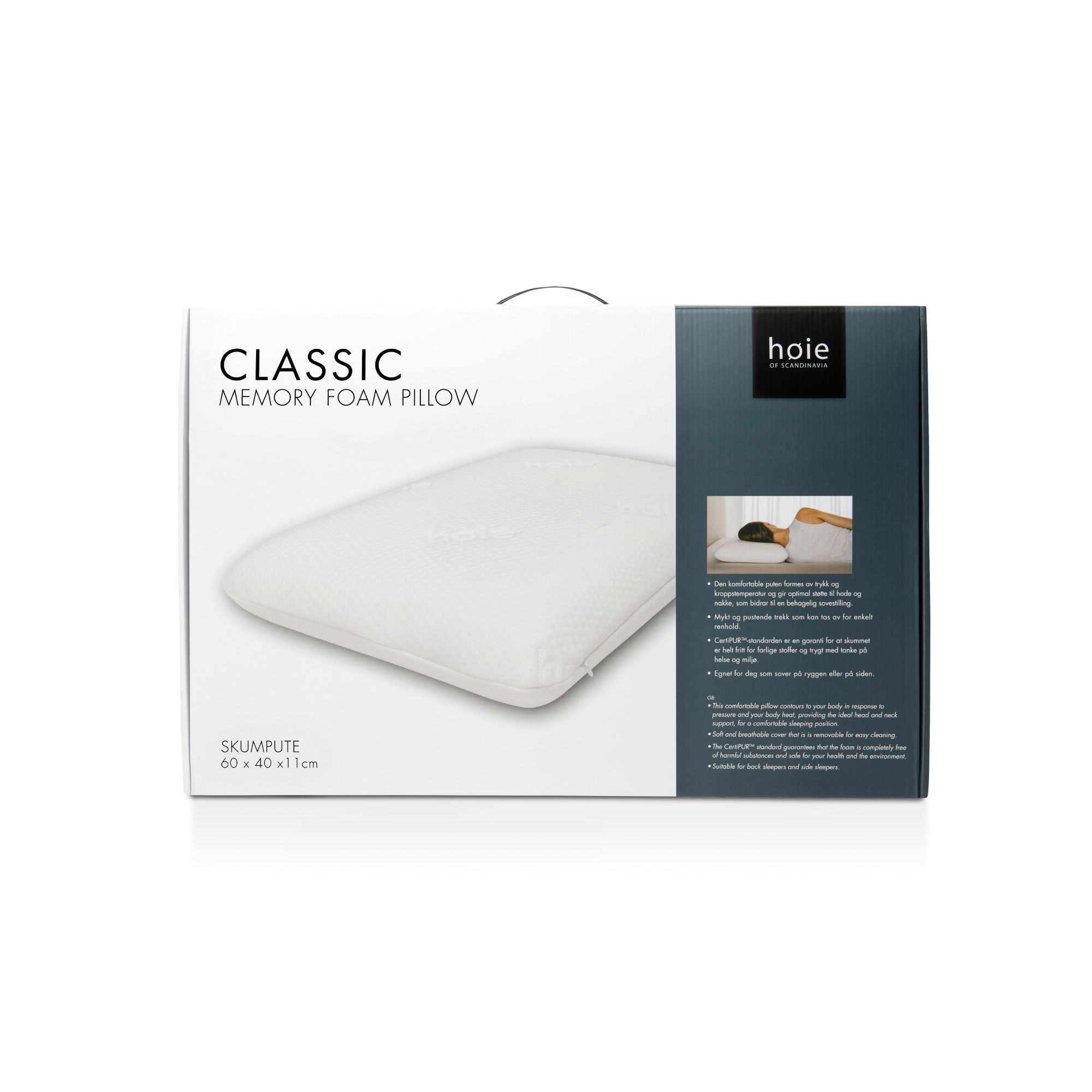 En god nats søvn afhænger i høj grad af, at du ligger godt og finder en optimal sovestilling. Høie Classic er en skumpude, der er udviklet specielt til at tilpasse sig din individuelle hoved- og nakkeprofil. Det temperaturfølsomme specialskum formes efter din krop ved hjælp af kropsvarmen, hvilket giver ergonomisk korrekt støtte og jævn trykfordeling. Den flade form giver ensartet støtte og passer til de fleste sovestillinger, samtidig med at den skaber en god balance mellem komfort og støtte.