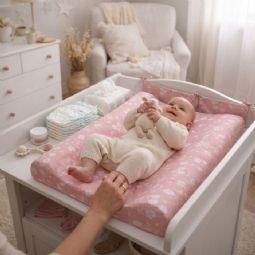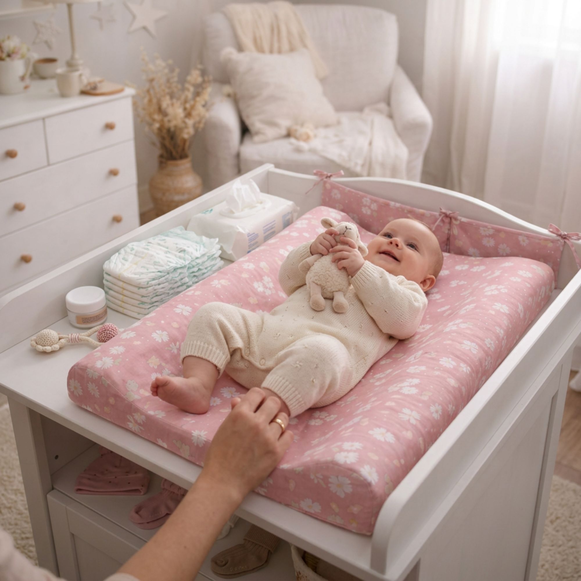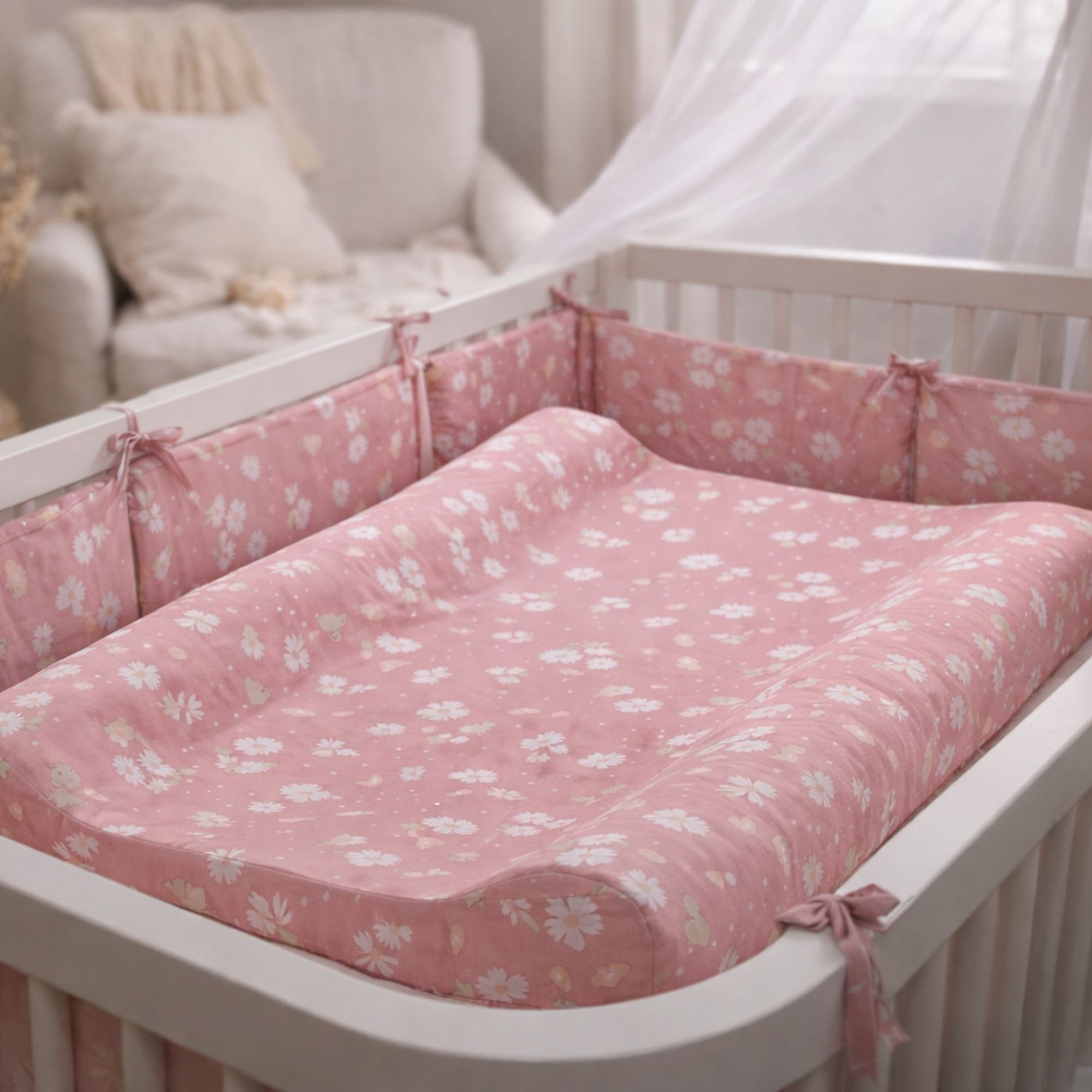 Skab en tryg og komfortabel pusleplads med denne puslepude fra Nordstrand Home i et fint lyserødt design med kaniner og blomster. Puslepuden måler 65x50 cm og passer til de fleste pusleborde og kommoder. De forhøjede kanter på 9 cm og den 4 cm tykke midte giver ekstra støtte og hjælper med at holde barnet sikkert placeret under hele pusletiden.