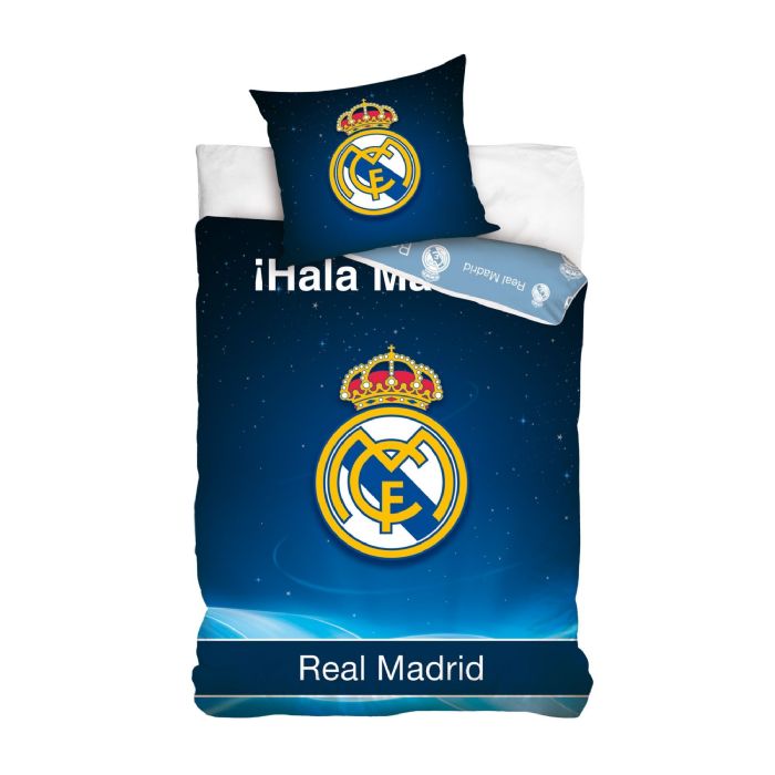 Blødt bomuldssengesæt, med design af Real Madrid logoet og teksten Hala Madrid. Perfekt til den lille fodboldfan, der elsker at spille. Produceret med lette og åndbare bomuldsfibre giver det sengesættet en følelse af blødhed, der gør at dynen vil falde natuligt rundt om dit barn.