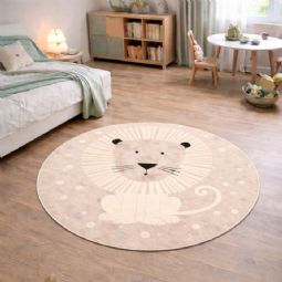 Et rundt løve gulvtæppe som dette er ikke kun en praktisk løsning – det er også en dekorativ detalje, der giver personlighed og varme til børneværelset.