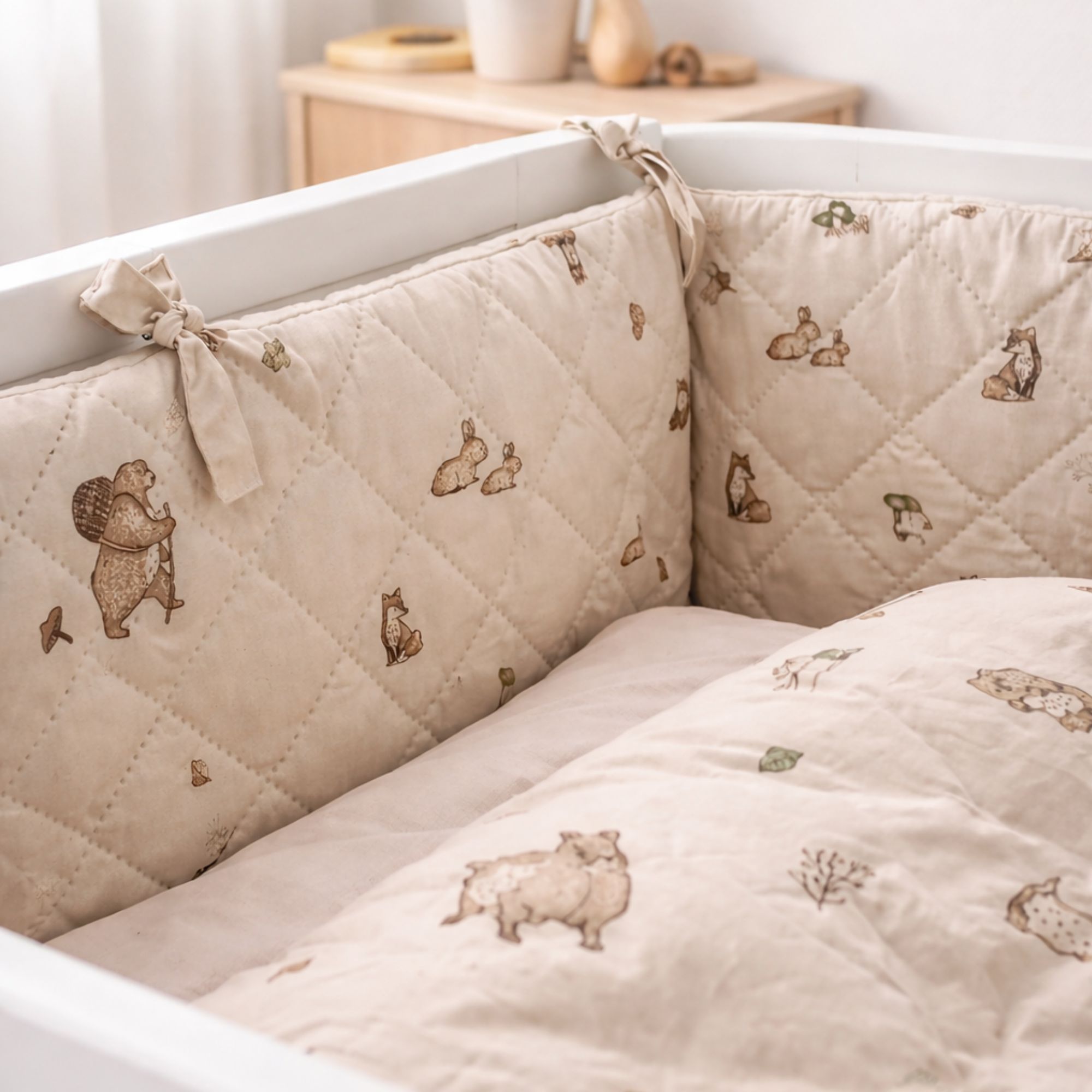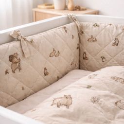 Det bløde betræk og det fine print med skovens dyr i sandfarvet nuancer skaber et hyggeligt og børnevenligt udtryk i babysengen. Sengeranden fastgøres nemt med de påsyede bindebånd, så den bliver siddende sikkert på plads.