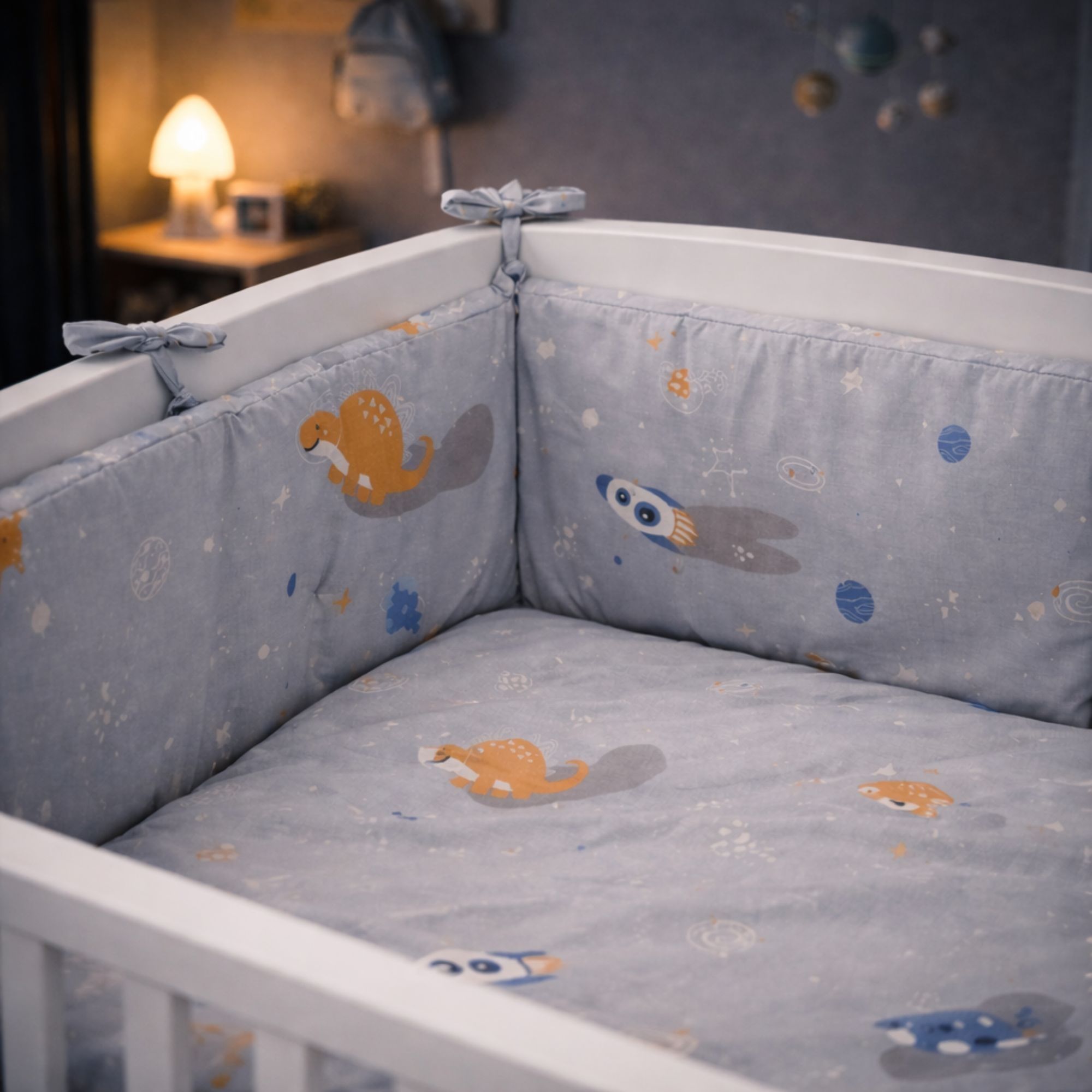 Betrækket er fremstillet i 100% blød bomuld, som føles behageligt og naturligt mod barnets hud. Det fine design i grå nuancer med rum dinosaur giver et sødt og roligt udtryk i børneværelset.