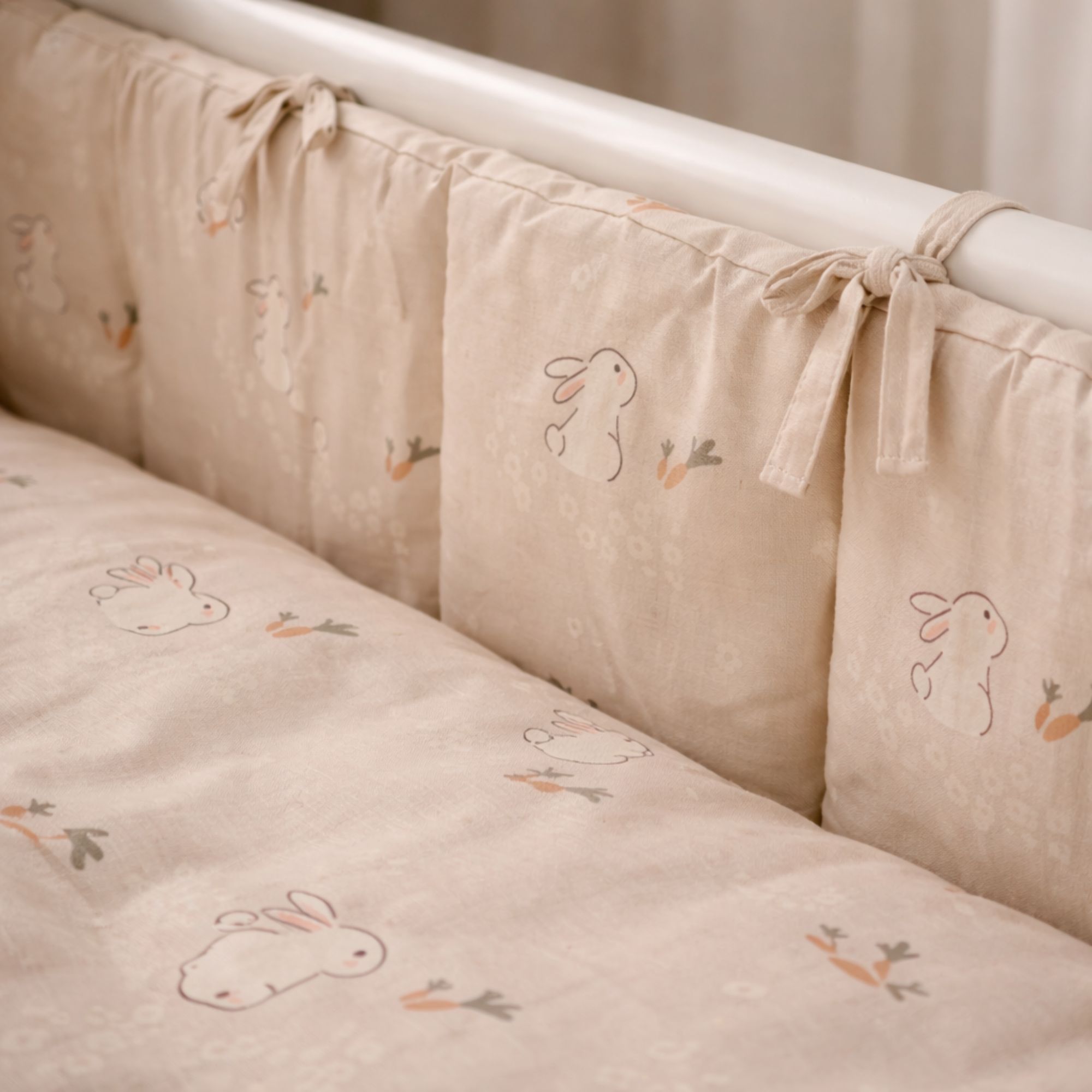 Betrækket er fremstillet i 100% blød bomuld, som føles behageligt og naturligt mod barnets hud. Det fine design i sand nuancer med kaniner giver et sødt og roligt udtryk i børneværelset.
