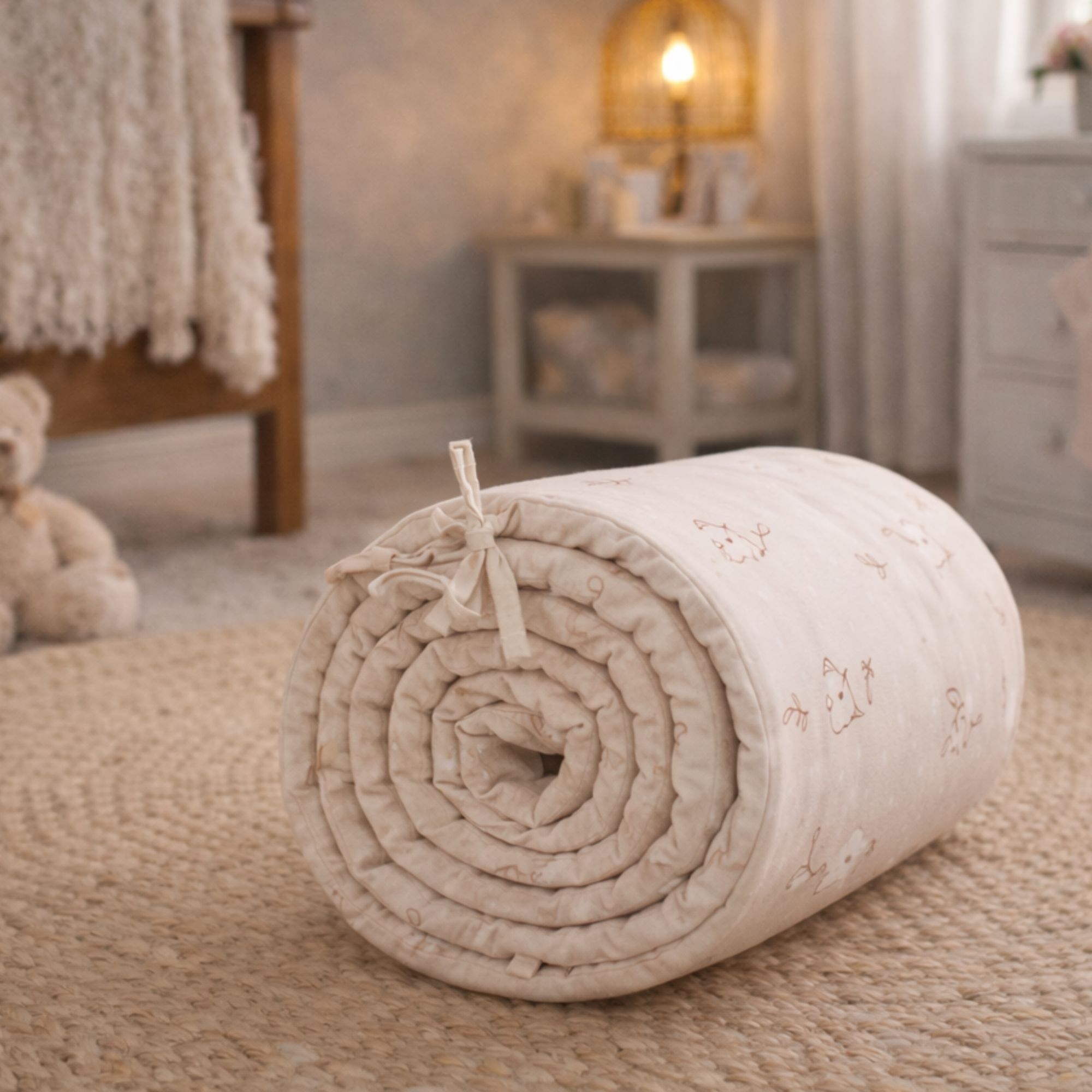 Sengeranden fastgøres nemt og sikkert med de påsyede bindebånd, så den bliver siddende på plads. Den kan vaskes ved 40° finvask, hvilket gør den nem at holde ren i en travl hverdag med baby.