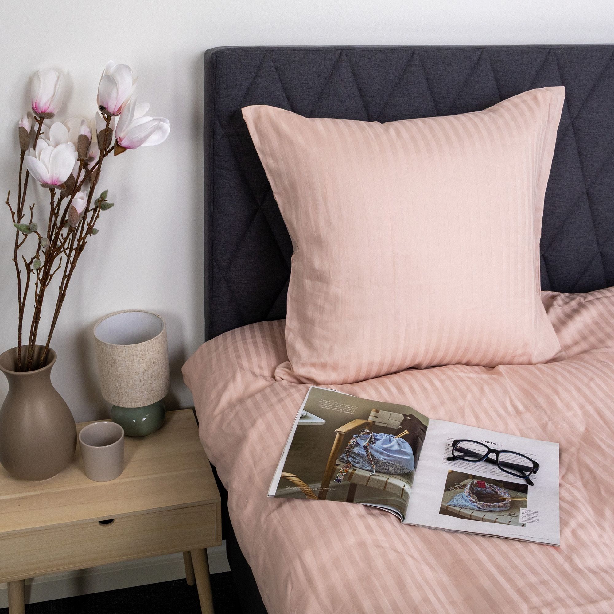 De jacquardvævede striber er vævet direkte ind i stoffet og skaber et diskret spil mellem matte og blanke flader. Denne væveteknik giver sengetøjet struktur og dybde uden brug af print og sikrer, at mønsteret forbliver flot og ensartet, selv efter gentagen vask. Det ensfarvede design gør det nemt at få sengesættet til at passe ind i alle former for indretning.
