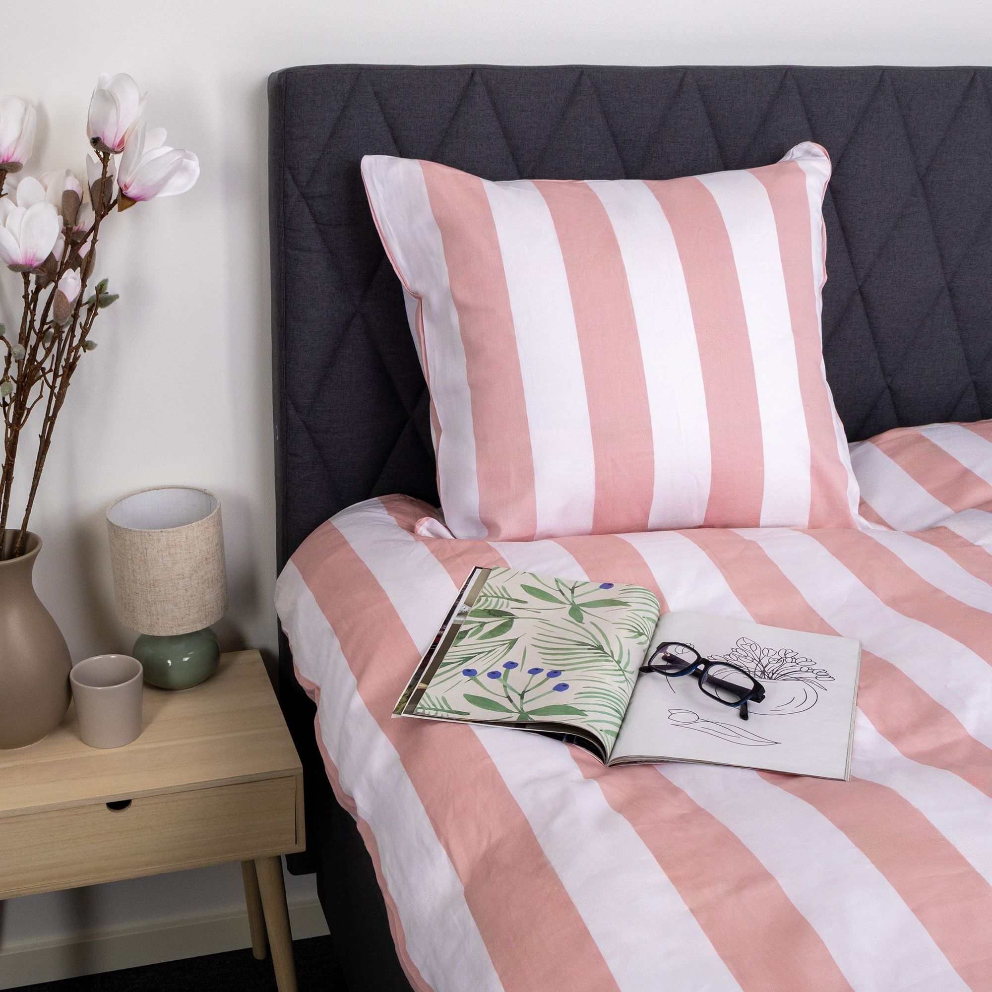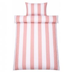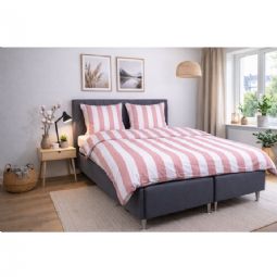 Det brede stribede print giver et skarpt og harmonisk udtryk. Kombinationen af lyserøde og hvide striber giver soveværelset et afslappet og roligt udtryk, samtidig med at designet er let at kombinere med forskellige puder.