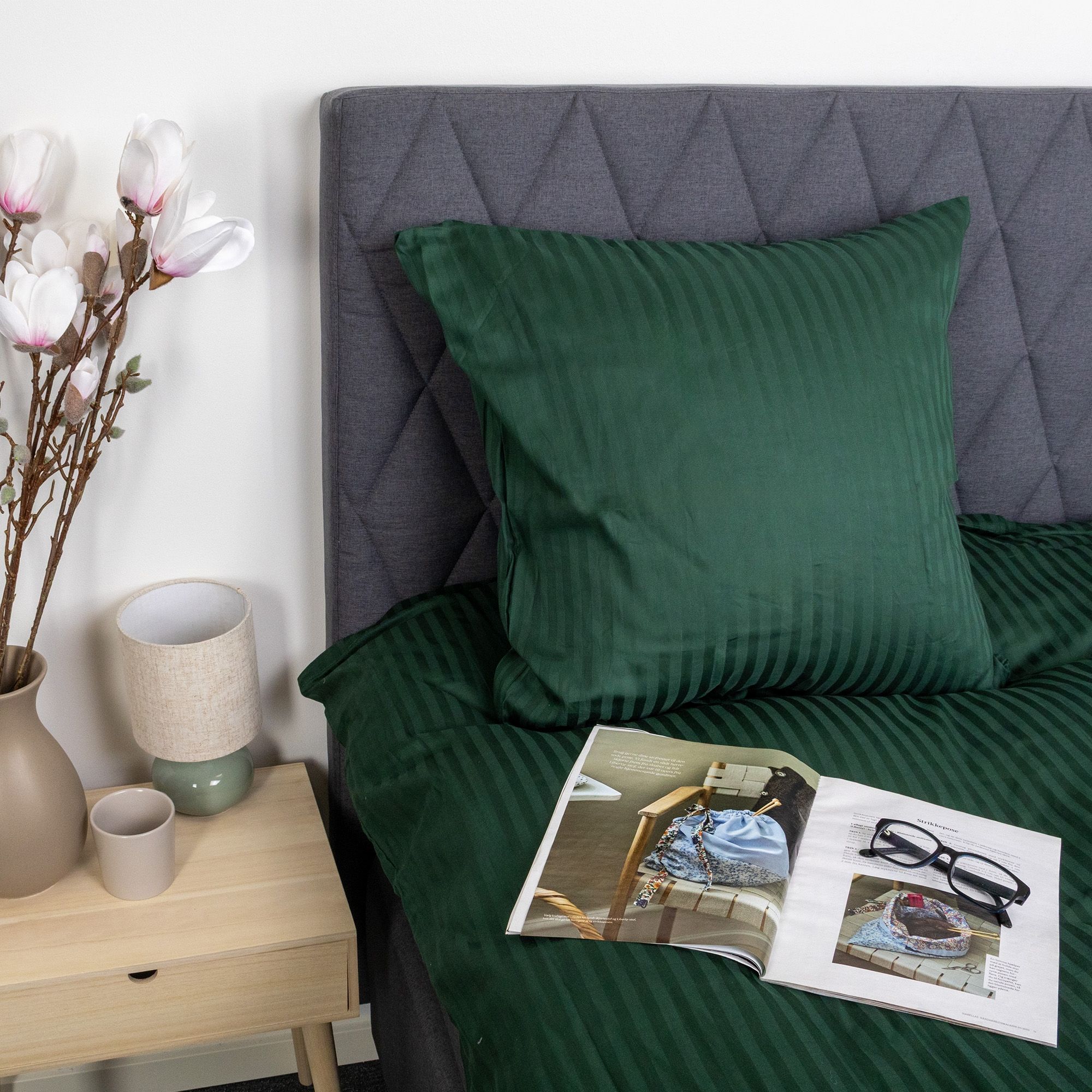 De jacquardvævede striber er vævet direkte ind i stoffet og skaber et diskret spil mellem matte og blanke flader. Denne væveteknik giver sengetøjet struktur og dybde uden brug af print og sikrer, at mønsteret forbliver flot og ensartet, selv efter gentagen vask. Det ensfarvede design gør det nemt at få sengesættet til at passe ind i alle former for indretning.