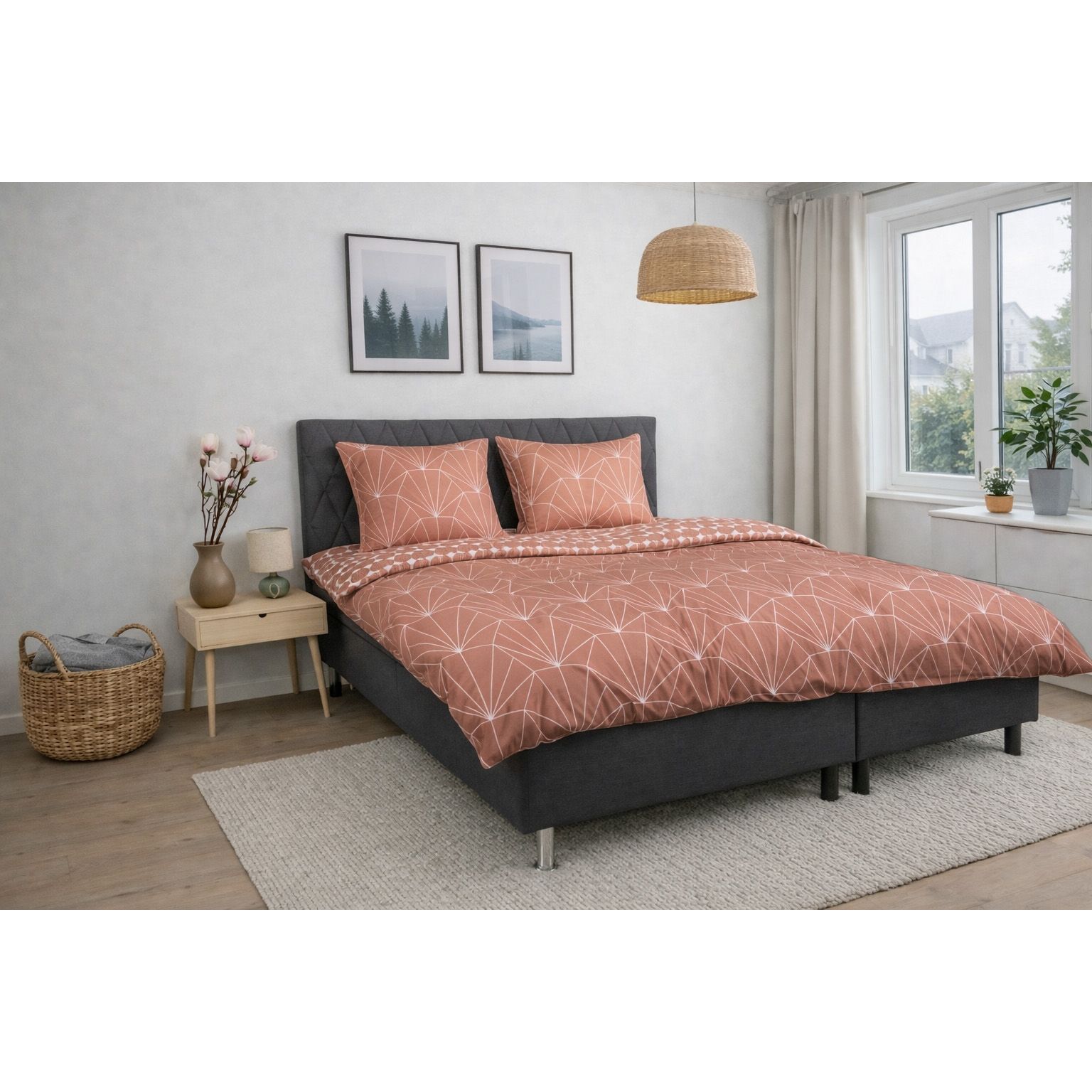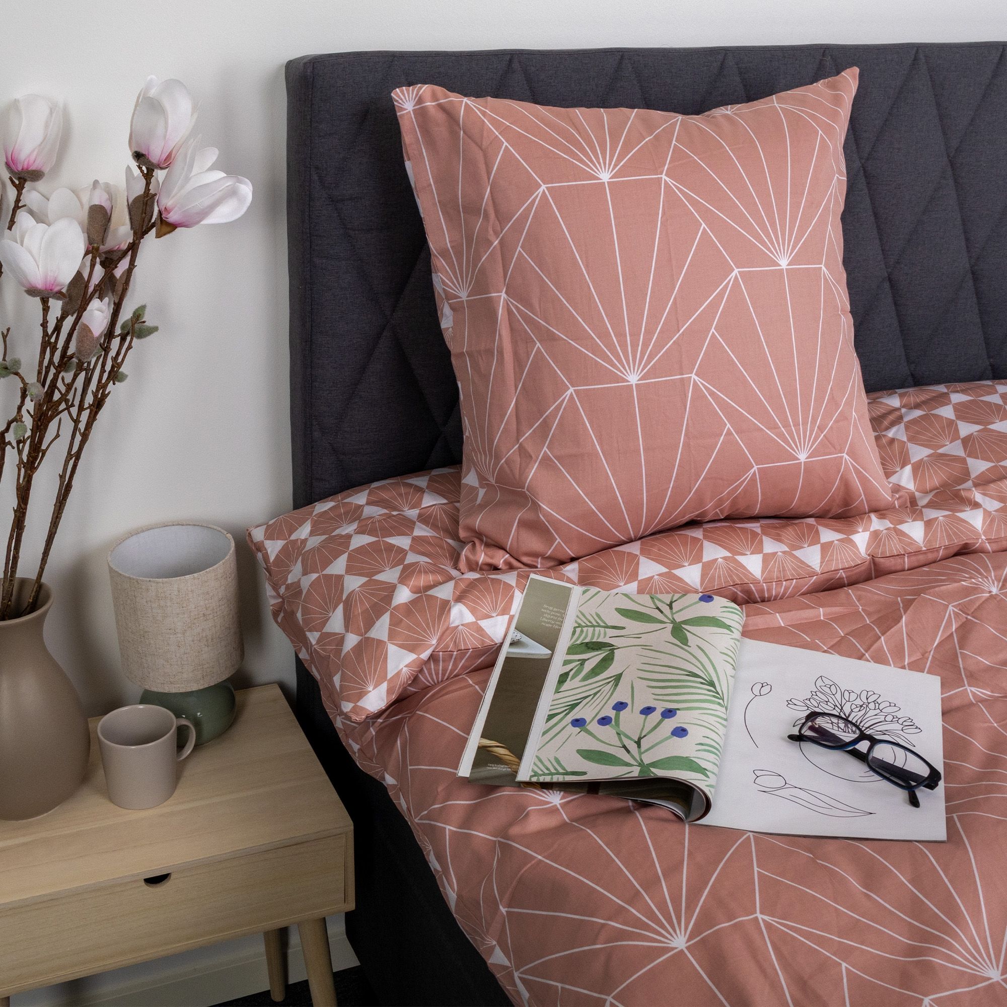 Det vendbare design giver dig to forskellige looks i ét sengesæt. Forsiden er dekoreret med et moderne grafisk mønster, mens bagsiden har et mere afdæmpet geometrisk udtryk. Det gør sengetøjet nemt at kombinere med forskellige farver, puder og plaider og giver større fleksibilitet i indretningen.