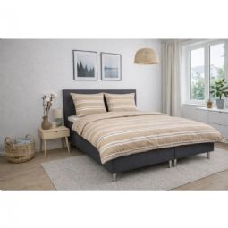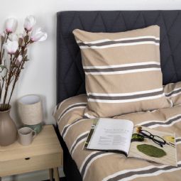 Det stribet design kombinerer flotte brune og hvide striber med en beige baggrund, hvilket skaber et roligt og harmonisk udtryk i soveværelset. Et stribet sengetøj, der både føles lunt og ser elegant ud.