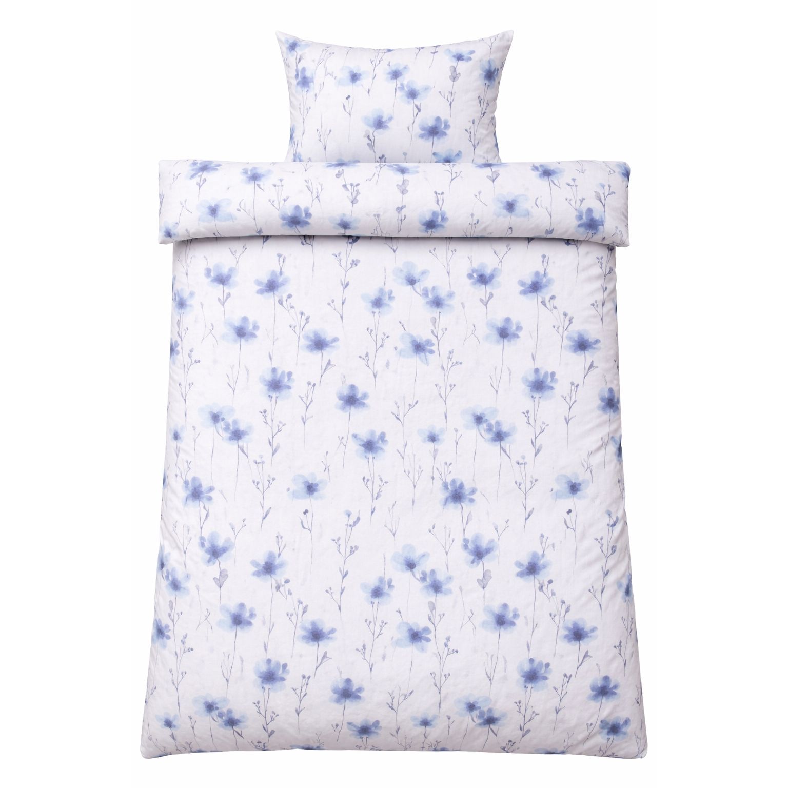 Det blomstrede design kombinerer flotte blå blomster med en lys baggrund, hvilket skaber et roligt og harmonisk udtryk i soveværelset. Et blomstret sengetøj, der både føles lunt og ser elegant ud.
