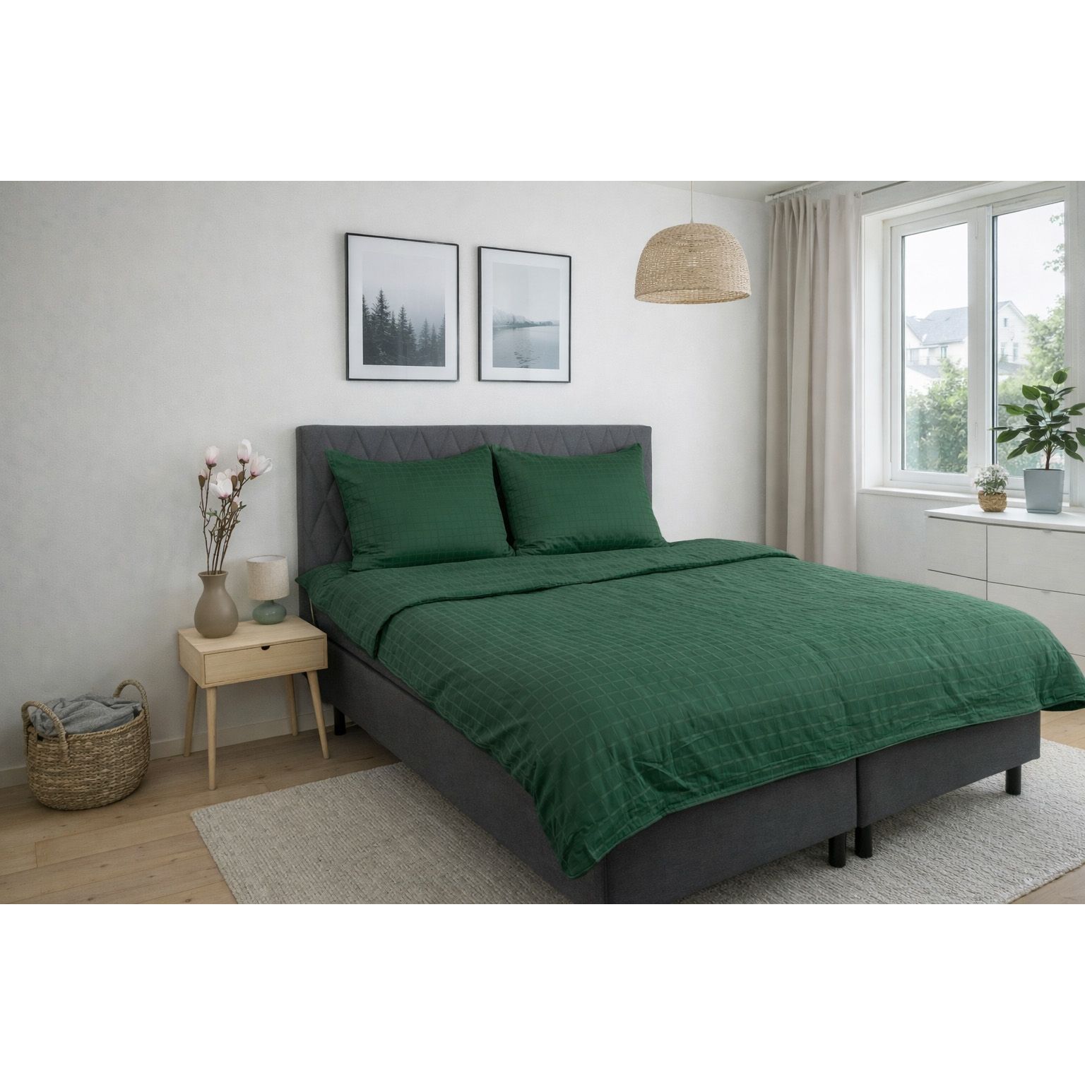 Det jacquardvævede ternede mønster er vævet direkte ind i stoffet og skaber struktur og dybde uden brug af print. Denne vævemetode sikrer, at mønsteret bevarer sit udtryk vask efter vask og giver sengetøjet et eksklusivt og gennemført look. Den grønne farve understøtter det rolige design og passer let ind i både moderne og klassiske soveværelser.