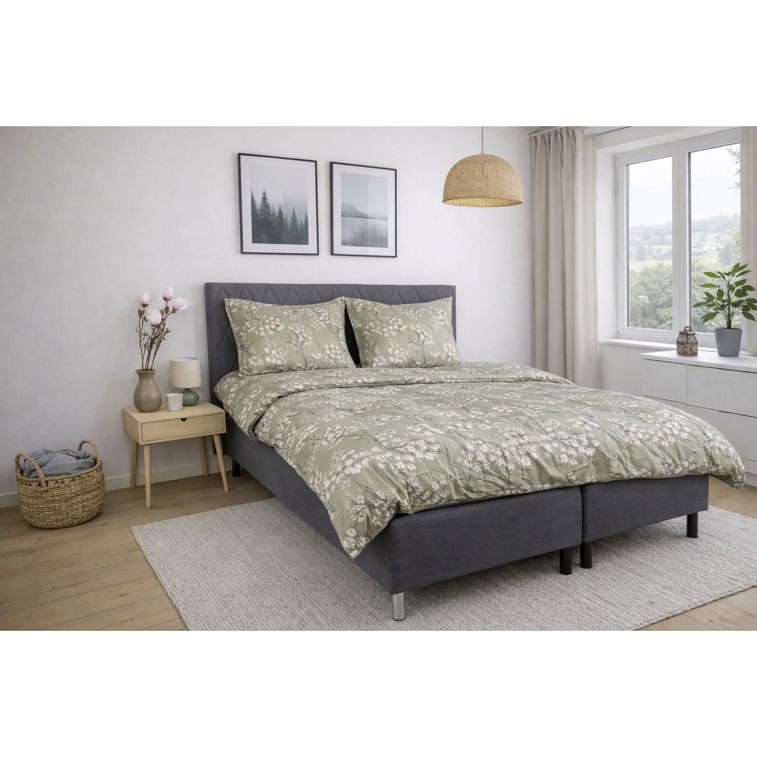 Det vendbare design giver to looks i ét sengesæt. Forsiden har et elegant blomsterprint i varme grønne nuancer, mens bagsiden er ensfarvet og mere afdæmpet. En fleksibel løsning, der gør det nemt at variere stilen i soveværelset.