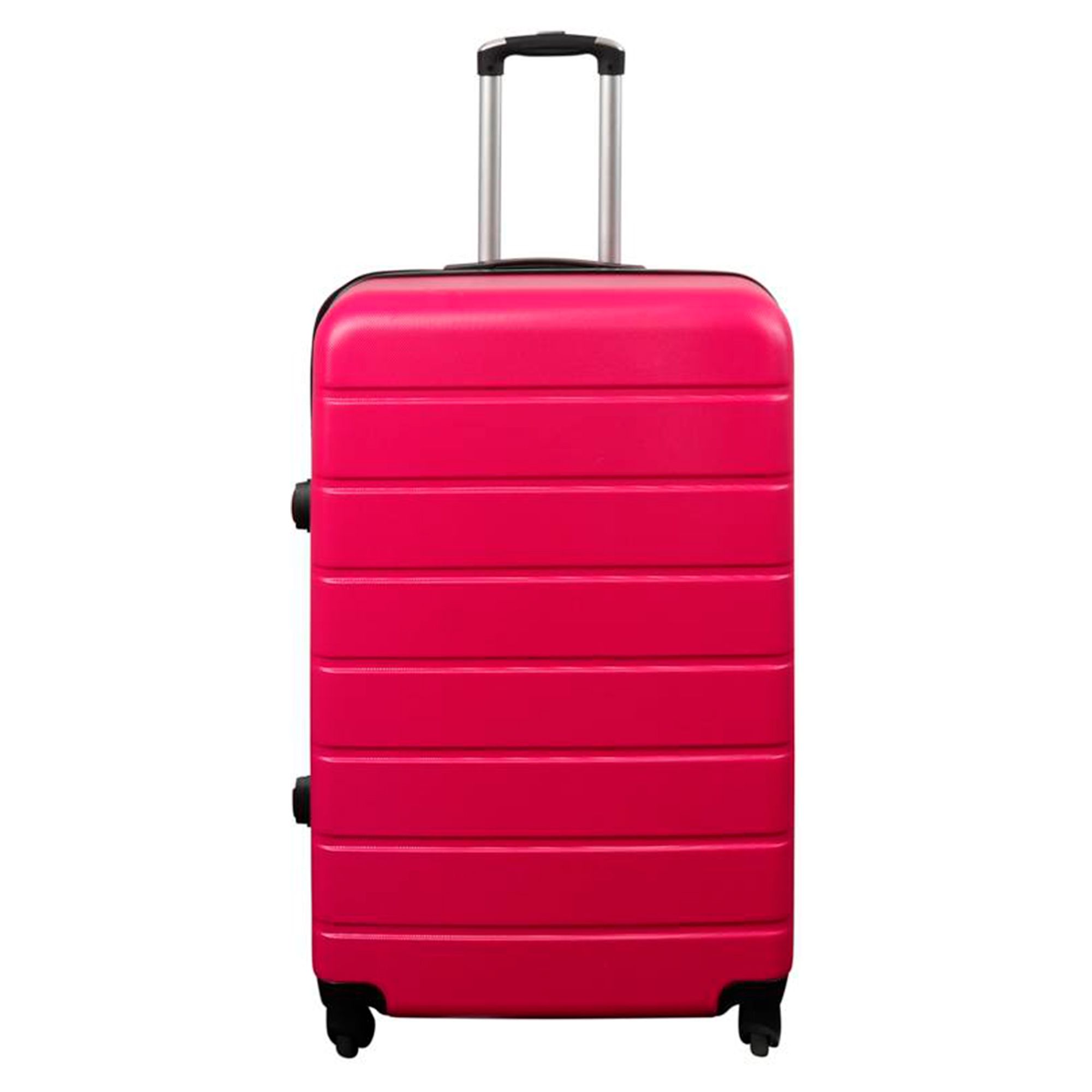 Stor kuffert i en flot pink farve, med vandrette linjer.