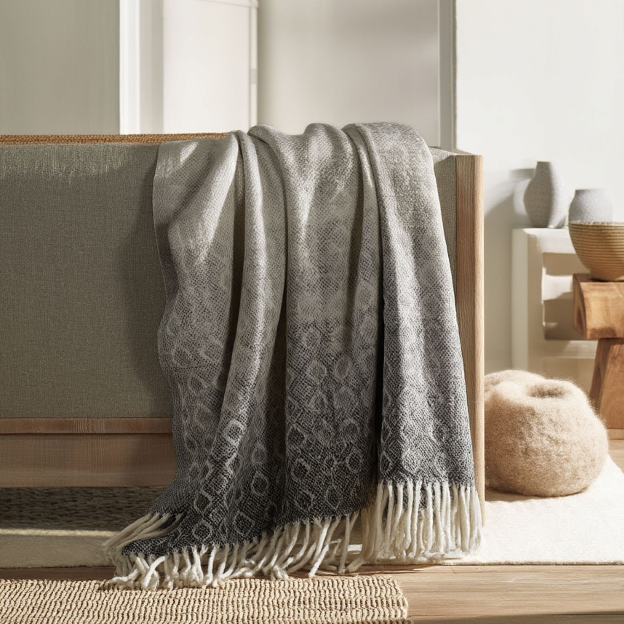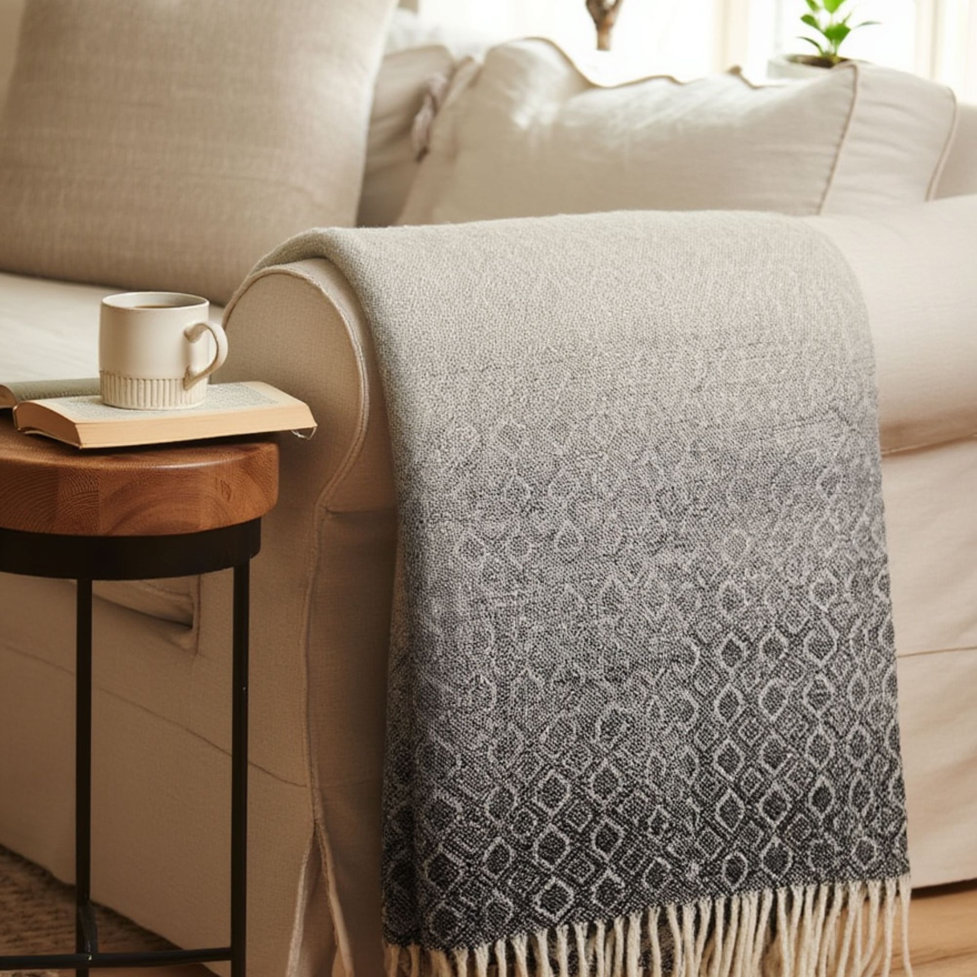 Det elegante mønster i flere grå nuancer skaber et smukt og levende udtryk, som tilfører dybde og karakter til indretningen. Plaiden passer perfekt ind i moderne skandinaviske hjem og kan bruges både som et praktisk tæppe og som en dekorativ detalje.
