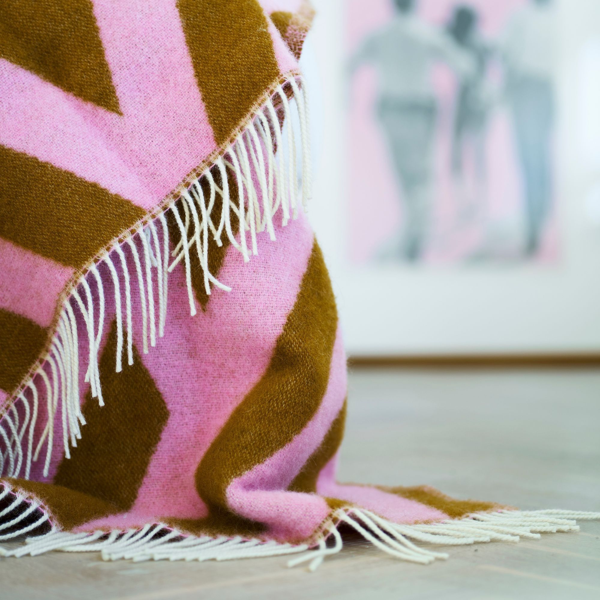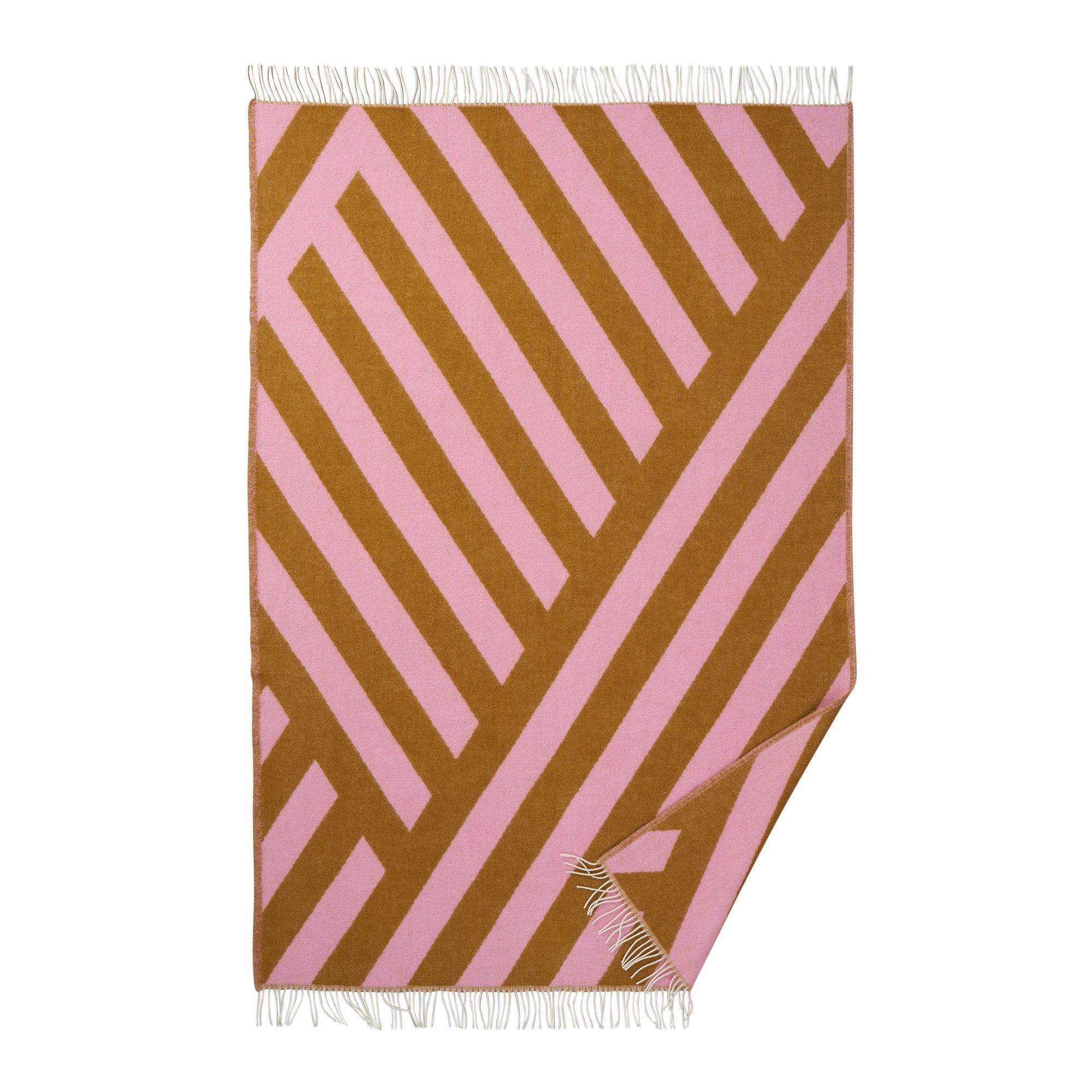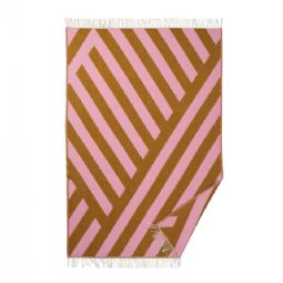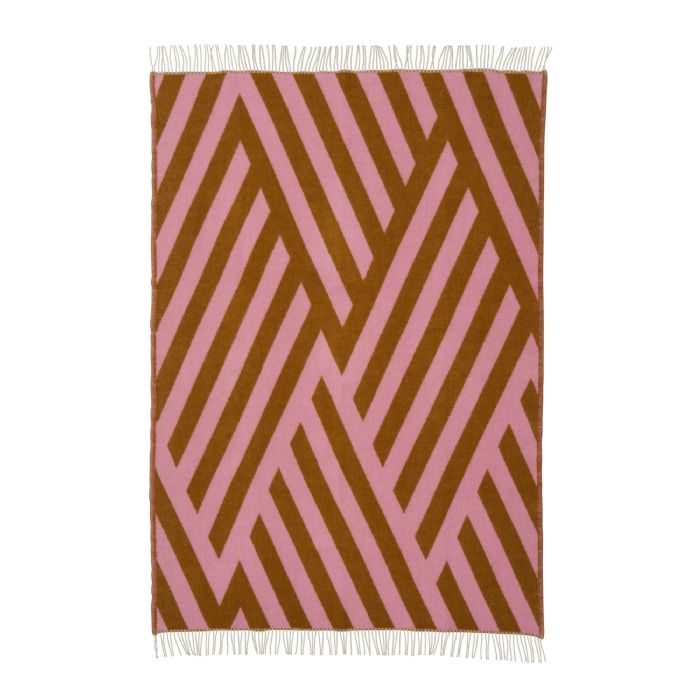 Det grafiske mønster med dynamiske linjer og vinkler skaber et levende og moderne udtryk, mens farvekombinationen i lyserød og rustbrun tilfører energi og personlighed til indretningen. Plaiden fungerer både som et praktisk tæppe og som et dekorativt statement piece.
